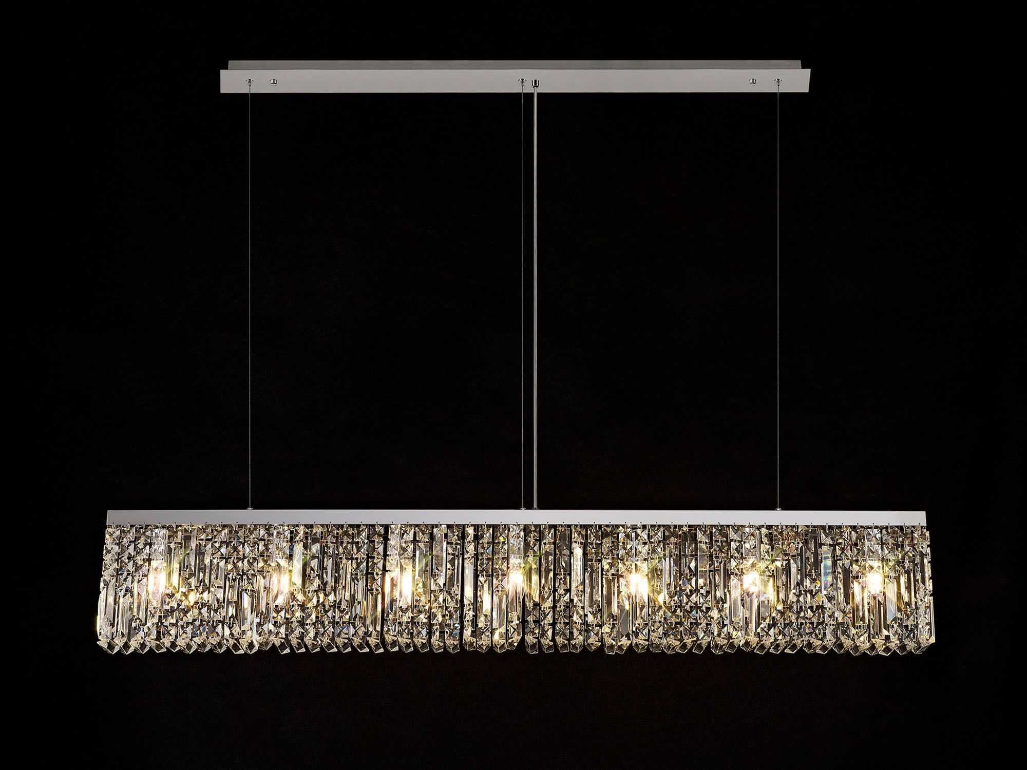 Linear Pendant Chandelier, the striking strands of crystal hang either side of the E14 lamp holders, and are joined beneath them with additional rectangular crystal pieces, to conceal the lamps used and heighten the sparkle when illuminated.