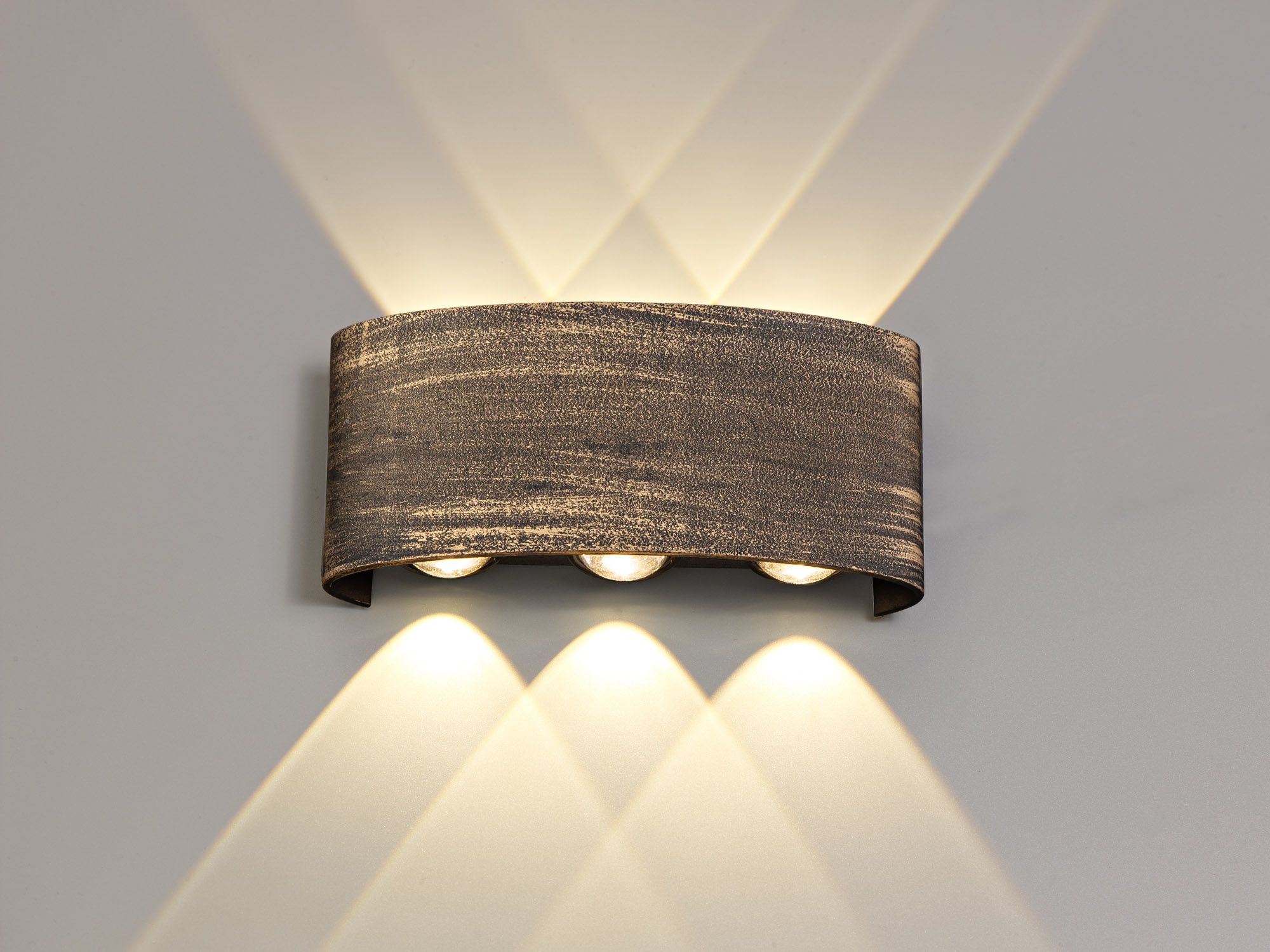 Its brushed gold/black colour finish gives a weathered, industrial quality to the sleek framework of this outdoor wall lamp.