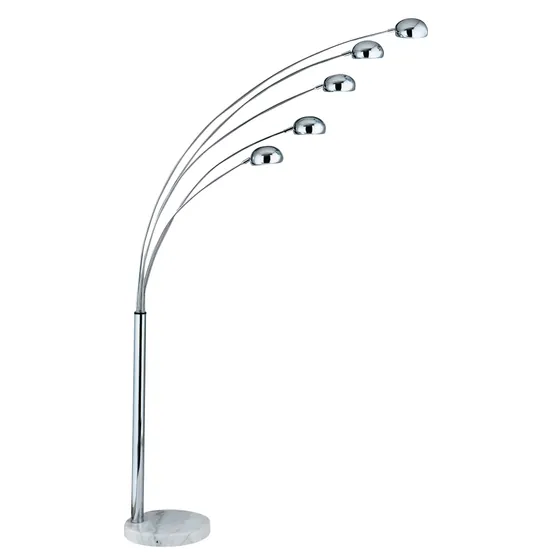This chrome Giraffe 5 light floor lamp is inspired by modern Italian design, with dome shaped, metal shades and stylish chrome finish. The marble base provides a solid foundation for the extravagant arc leading to the five eye-catching chrome dome shades.