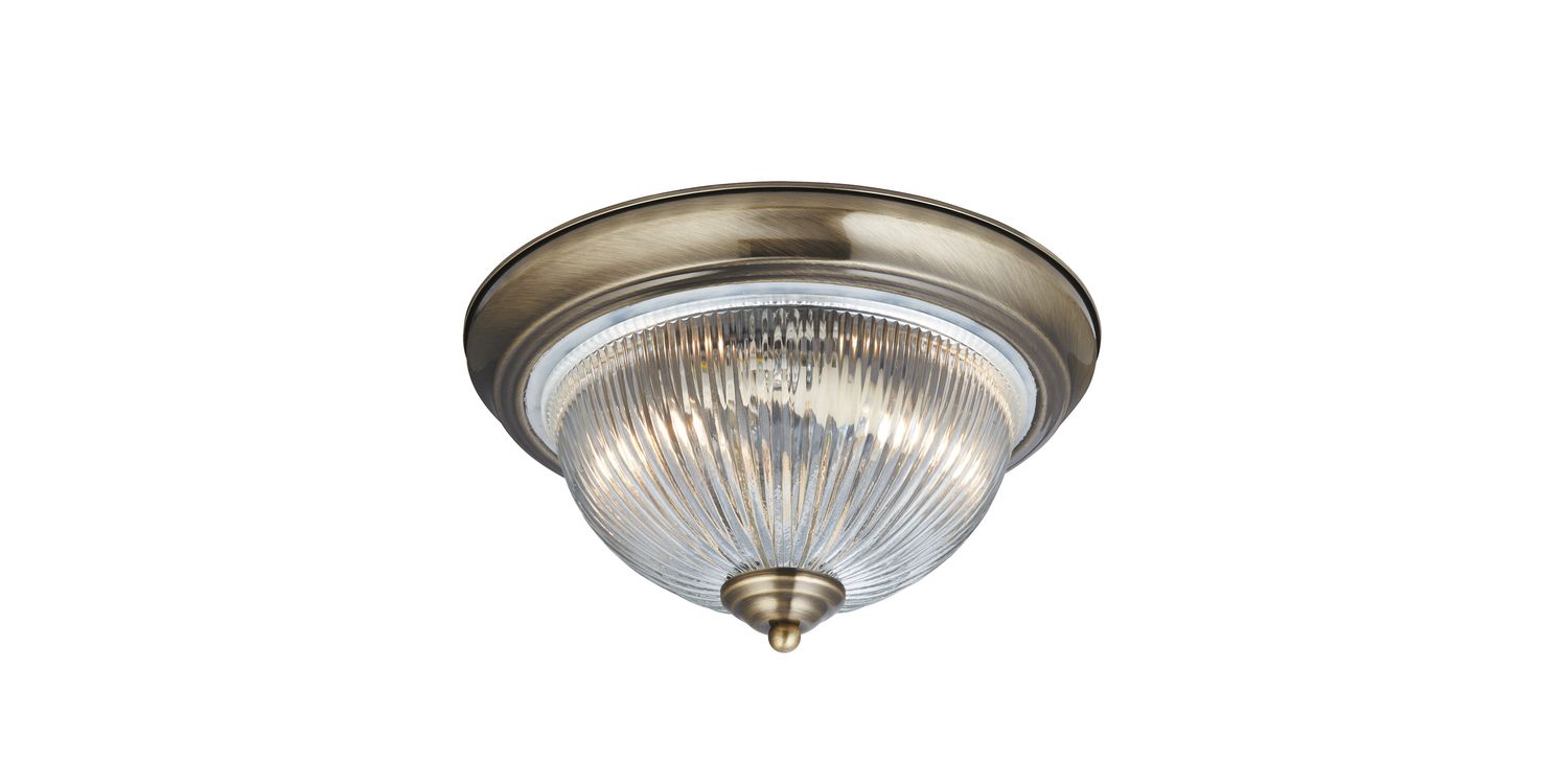This American Diner antique brass flush light looks beautiful on any ceiling, with simplicity and style inspired by the era of the classic American Diner. The clear ribbed glass diffuser provides clean lighting effects, which are perfect for your kitchen or bathroom, and the matching metal trim finished in antique brass completes the look. This item has a rating of IP44, meaning that it is fully splash proof and suitable for use in a bathroom setting. 150mm H x 290mm W x 290mm L 150mm Total Height Bulb Type- E14 Not Included
