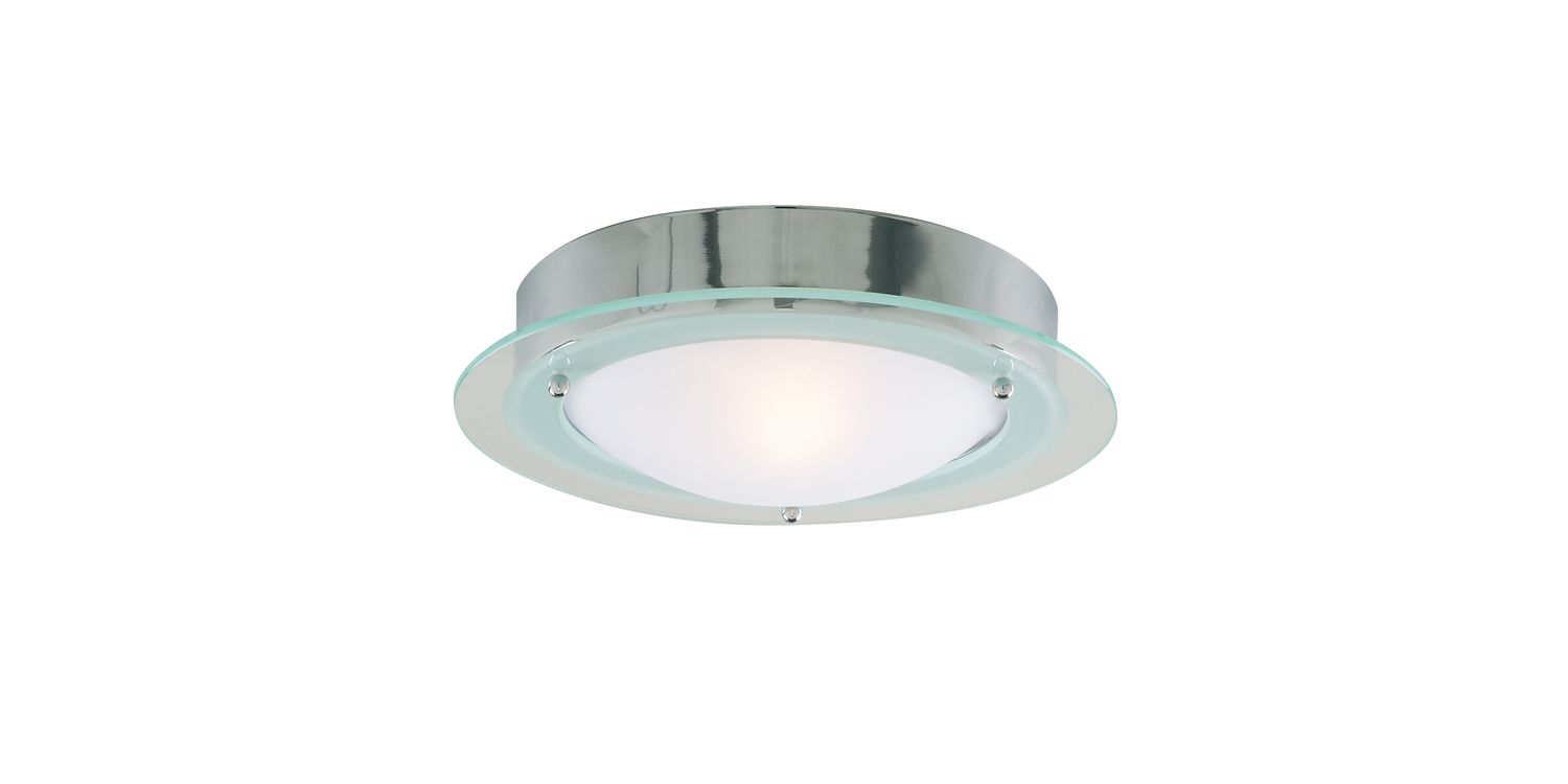 The Belfast chrome flush fitting with clear and acid glass shade is ideal for the ceiling of any modern bathroom or kitchen. The domed glass shade looks beautiful, surrounded by a stylish glass and chrome finish, and the fitting makes a great central source of light. This flush fitting is also IP44 rated and fully splashproof. 100mm H x 300mm W x 300mm L 100mm Total Height Bulb Type- E14 Not Included