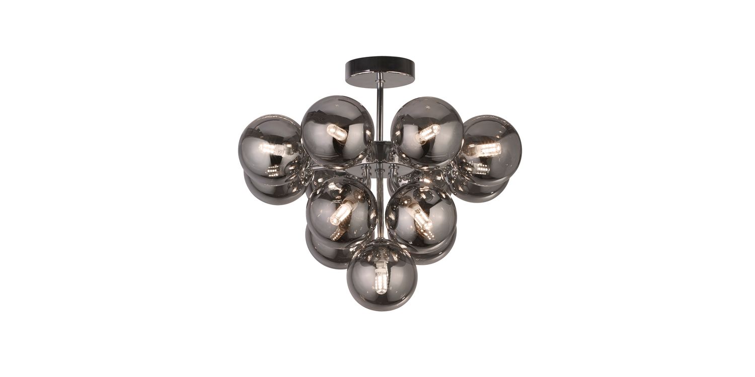 The Berry ceiling Semi-Flush has 13 lights within a pyramid of stunning smoked glass balls. This minimalist pendant is sleek and modern and will add style to any room in your home 350mm H x 410mm W x 410mm L 350mm Total Height Bulb Type- G9 Not Included