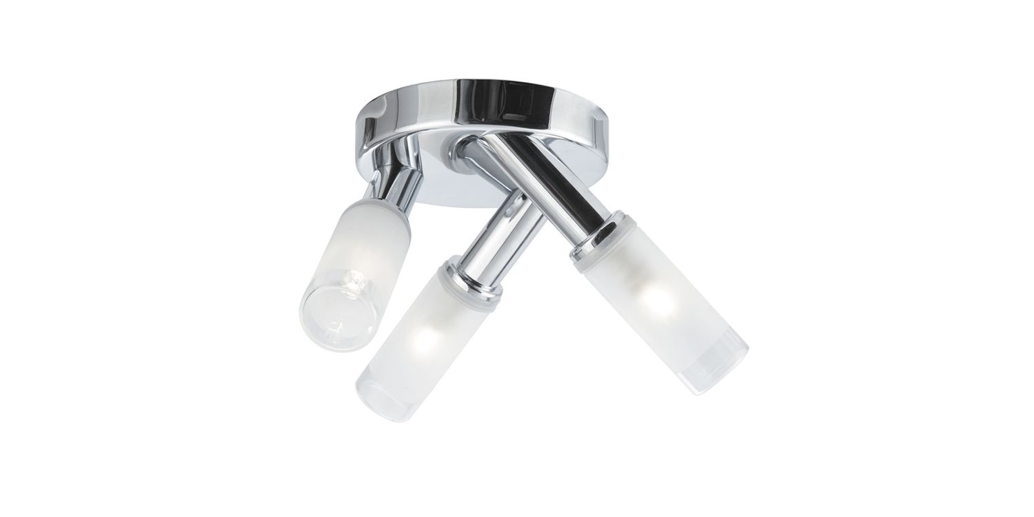 Add a stylish finish to any bathroom or kitchen with the Bubbles round spotlight. With a chrome circular ceiling plate and 3 lights adorned with a frosted glass shades with a bubble effect, this spotlight is a simple way to add a contemporary finish to any bathroom due to its IP44 rating. The LED technology means that this spotlight is energy efficient. 140mm H x 240mm W x 240mm L 140mm Total Height Bulb Type- G9 Not Included
