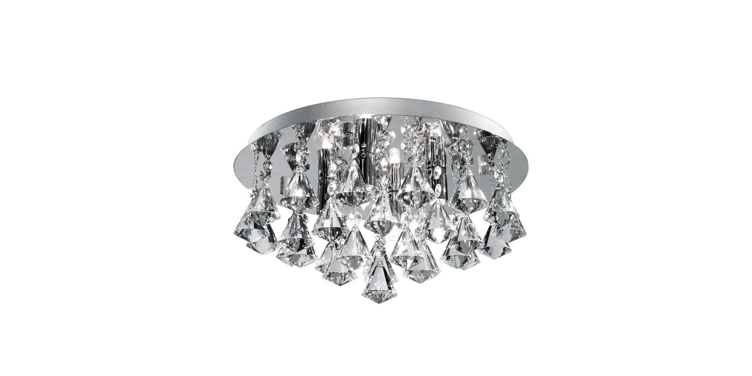 Add a dazzling effect to your bathroom using this striking Hanna flush fitting with clear pyramid crystal drops light in chrome. The four lights suspend from a chrome base and the crystal drops add a particularly elegant touch. Add as a centre piece to any sophisticated bathroom. This item has a rating of IP44, meaning that it is fully splash proof and suitable for use in a bathroom setting. LED's use up to 75% less energy and last up to 20 times longer than incandescent bulbs. 175mm H x 380mm W x 380mm L 175mm Total Height Bulb Type- G9 Not Included