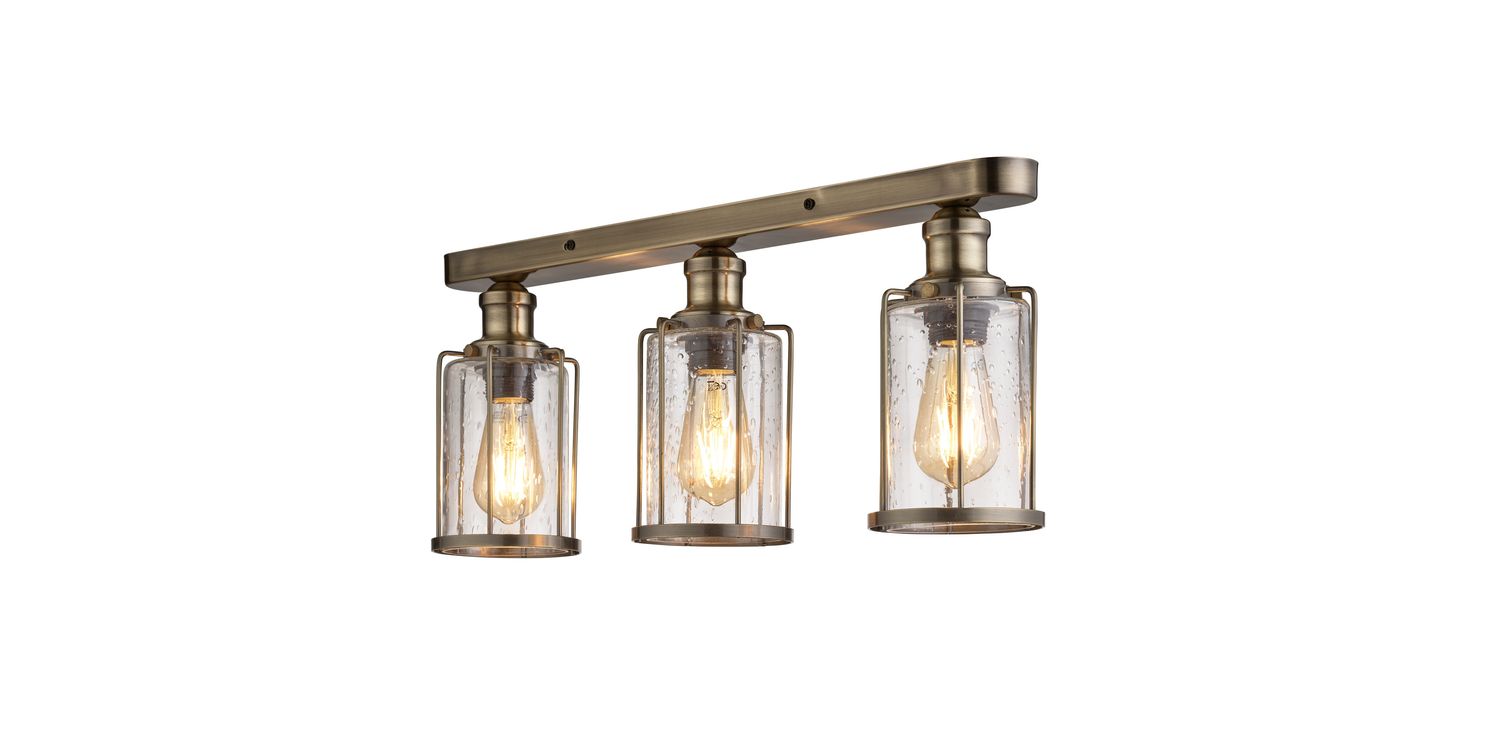 Pipes is a simple glass 3 light flush ceiling light with a rustic bubbled finish to the glass and an antique brass trim. With 3 glass shades displaying the lamps hanging from a the antique brass bar, this flush is ideal for a kitchen, diner or living area. 245mm H x 120mm W x 580mm L 245mm Total Height Bulb Type- E27 Not included