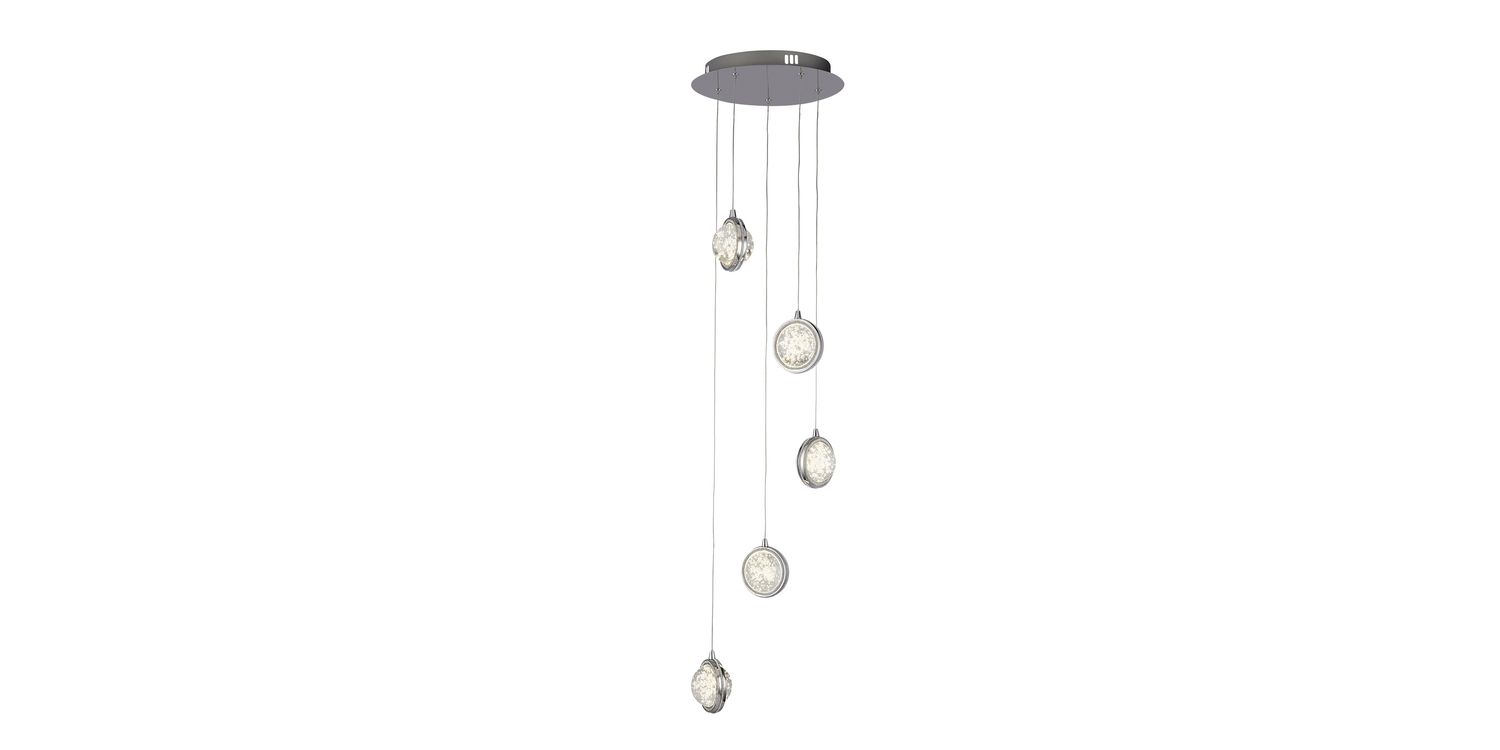 Add this eye-catching 5 light multi-drop pendant to any modern interior space to make a feature. This pendant in chrome has bubble glass surrounded by a beautiful diamante detail which are height adjustable meaning that this will add the perfect statement to any kitchen, dining room or bar area. 1500mm H x 310mm W x 310mm L 1500mm Total Height Bulb Type- LED Intergrated