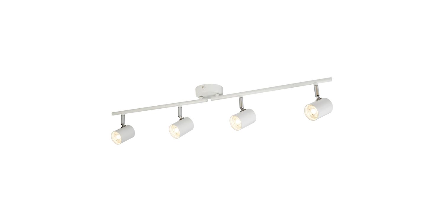 Add brightness to any room using this Rollo 4 light split bar spotlight. It is ideal for placing in a modern kitchen, or any room needing a warm spread of light. The 4 cylindrical shades are fully adjustable to direct light where needed, and sat on a rectangular white metal ceiling plate. The shades house LED technology, making this an energy efficient spotlight bar, ideal for helping to reduce household bills. 130mm H x 90mm W x 780mm L 130mm Total Height Bulb Type- LED Intergrated