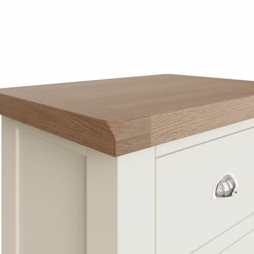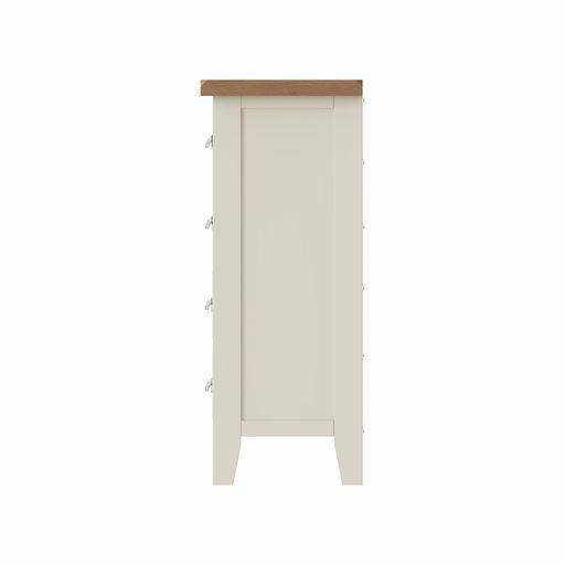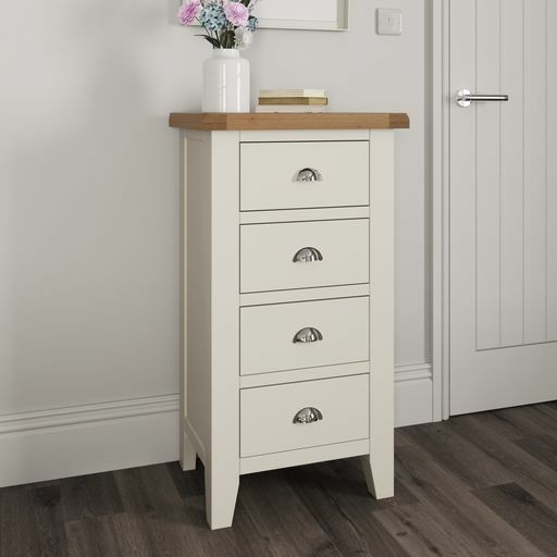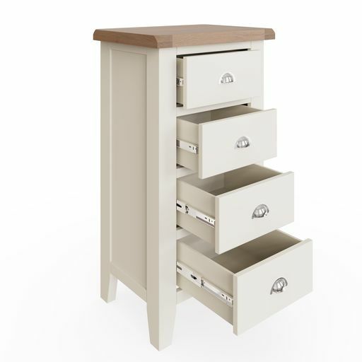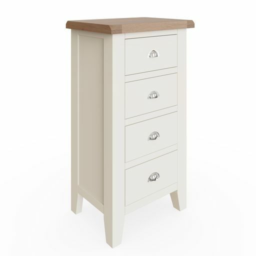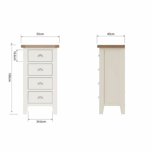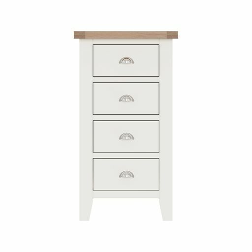 Tay Bedroom-White 4 Drawer Narrow Chest 55 x 40 x 100 cmWith chunky contrasting gently lime washed tops and chrome handles, this white painted collection blends classic and Contemporary influences for a style all of it's own.Drawers on metal runnersChrome cup handlesLook out for more from this range