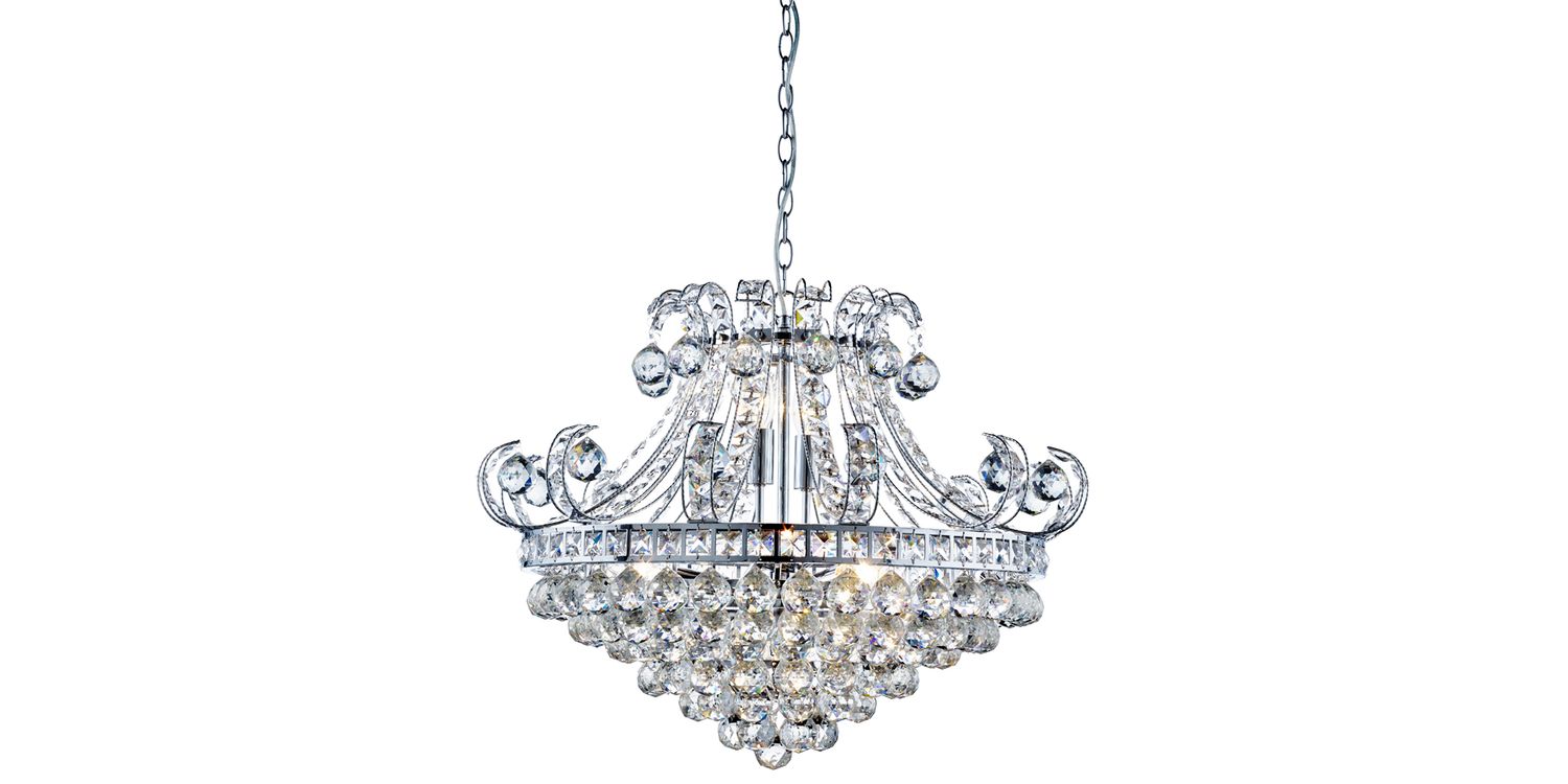 The Bloomsbury chrome 6 light chandelier with clear crystal buttons and drops is unmistakably elegant and stylish. The chrome finish circular frame has a twisted design, dressed with suspended crystal drops and an opulent crystal arrangement below. Although the design is highly traditional, the chrome finish lends the chandelier a modern touch and the six lamps will refract the light beautifully in any bedroom, living room or dining area. 1700mm H x 640mm W 1700mm Total Height Bulb Type- E14 Not Included