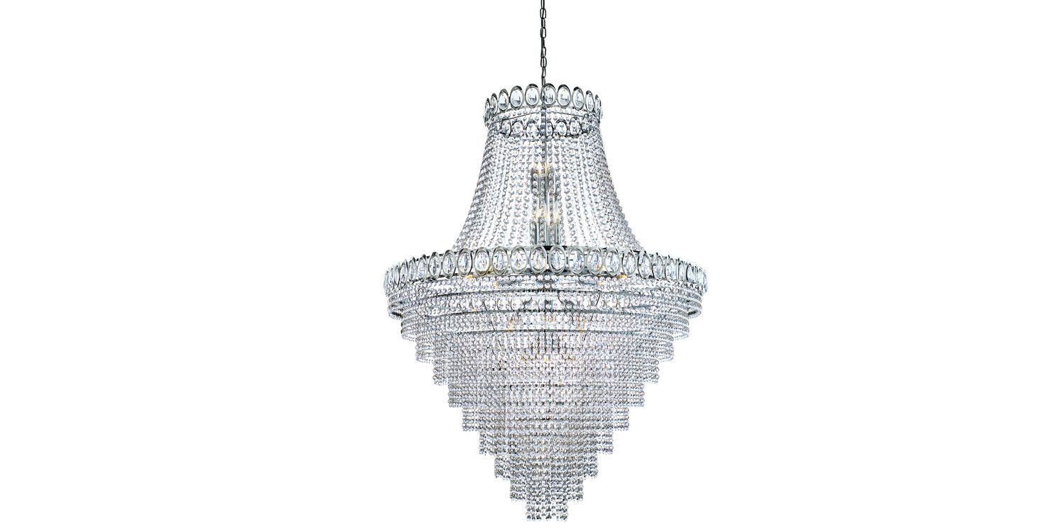 This Louis Philipe chrome 28 Light chandelier with crystal strings and beads looks magnificent hanging from any ceiling. The majestic, traditional chandelier features cascading strings of crystal, surrounded by intricate detailing, with concentric rings of crystal beads flowing down to its base. The stylish fitting has a modern chrome finish and features 28 lights, which illuminate the chandelier to stunning effect. 3900mm H x 1000mm W x 1000mm L 3900mm Total Height Bulb Type- E14 Not Included