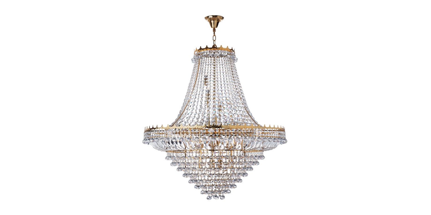 This Vesuvius extra large gold oval 19 light chandelier with clear crystal coffin drops and balls looks stunning in any main room or entrance. The colossal traditional chandelier is brimming with intricate trimmed crystal which hangs in, around and below two beautiful crowns finished in gold. It looks amazing when the nineteen lights are lit up at night and makes a bold statement in any home. 3500mm H x 1020mm W 3500mm Total Height Bulb Type- E14 Not Included