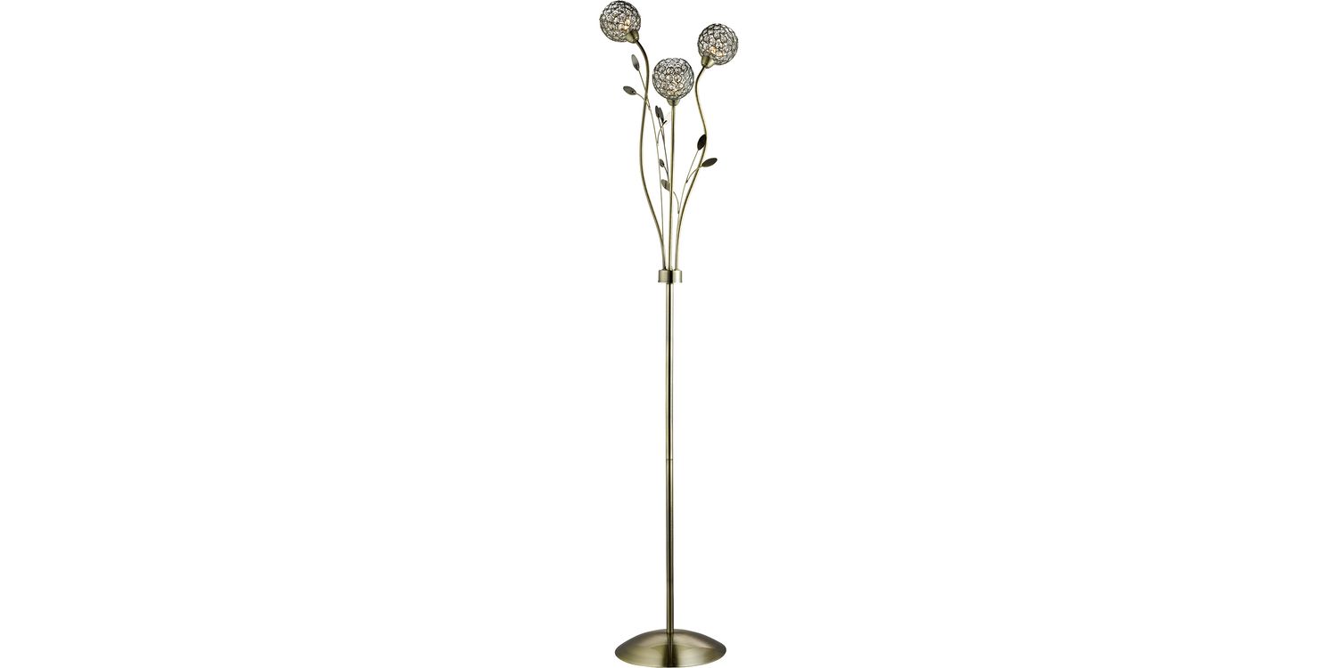 This Bellis II antique brass 3 light floor lamp with clear glass shades and leaf decoration looks beautiful in any traditional bedroom, living room or dining room. This intricate lamp has three delicate round flower heads, made from miniature antique brass finish hoops and clear glass buttons, which create an elegant lighting effect in any corner of your home. 1660mm H x 285mm W 1660mm Total Height Bulb Type- G9 Not Included