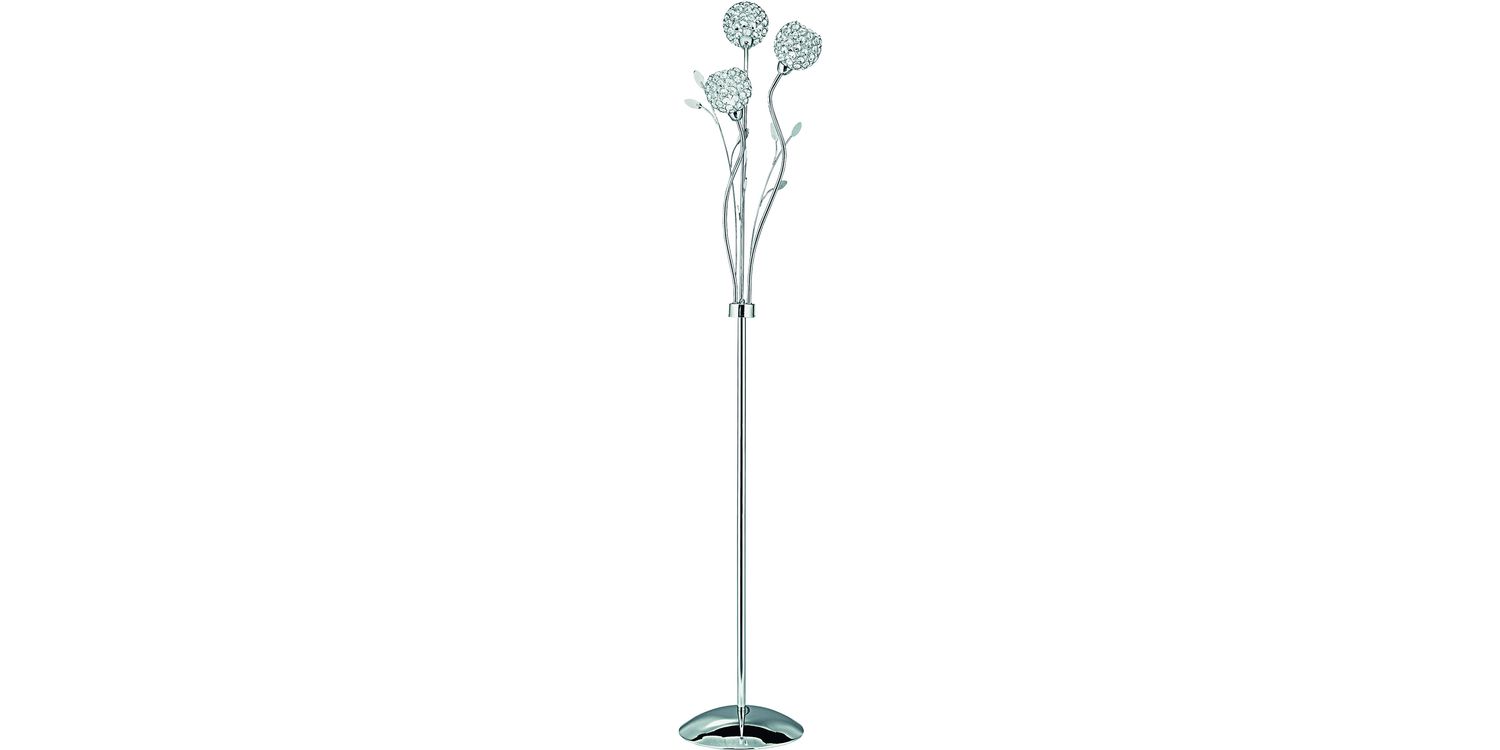 This Bellis II chrome 3 light floor lamp with clear glass shades and leaf decoration looks beautiful in any modern bedroom, living room or dining room. This intricate lamp has three delicate round flower heads, made from miniature chrome finish hoops and clear glass buttons, which create an elegant lighting effect in any corner of your home. 1660mm H x 285mm W x 285mm L 1660mm Total Height Bulb Type- G9 Not Included