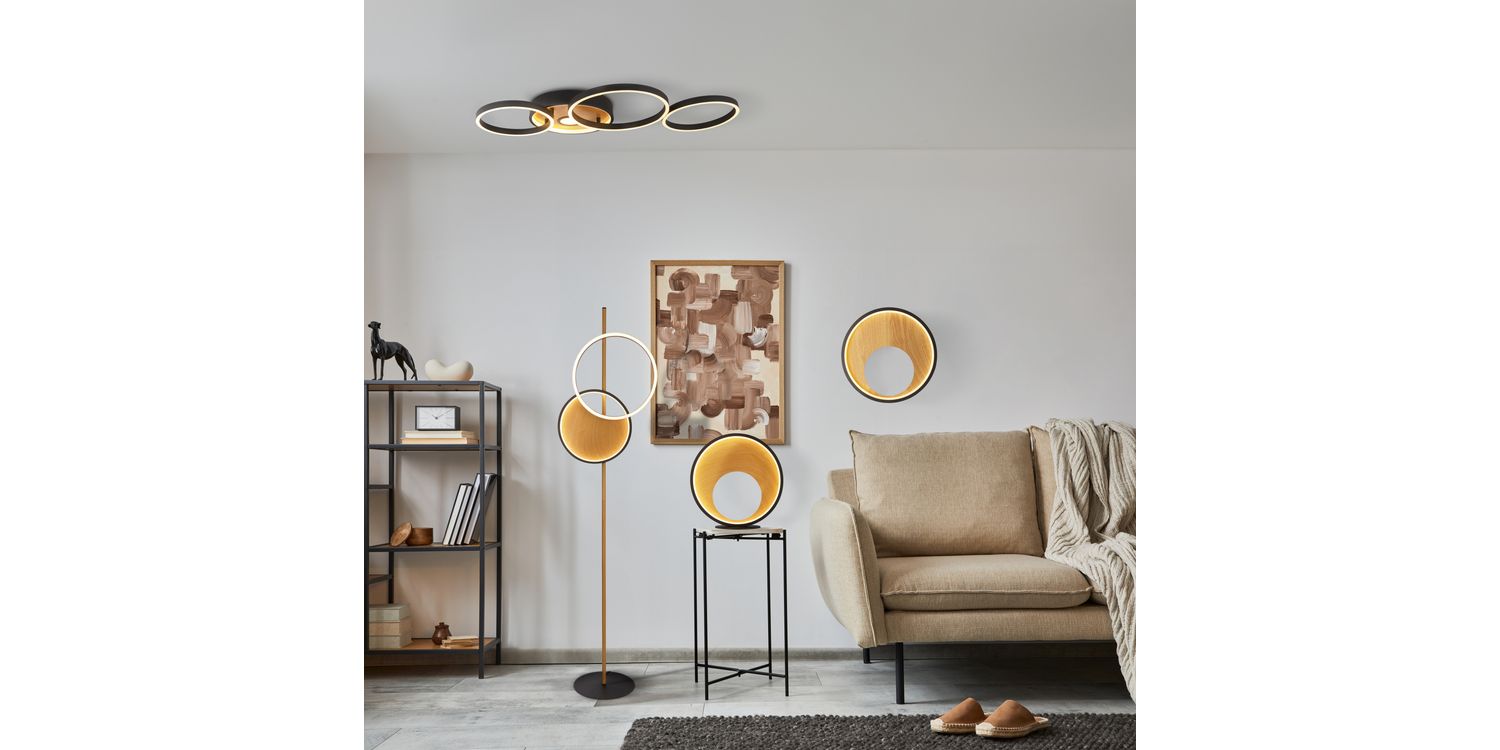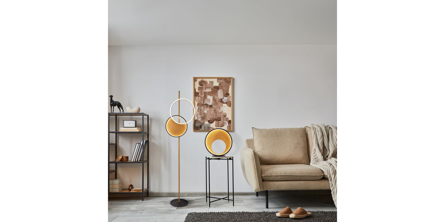 Finished in modern matt black and natural wood, the floor lamp will be a statement piece in any living area, bedroom or dining room.