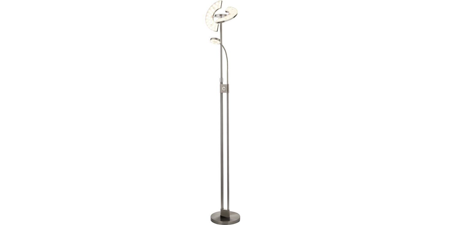 The funky design of the Gio floor lamp makes it perfect for modern living spaces and home offices alike. It features one disc LED with an acrylic shade and 2 half circle lights which can be adjusted to give you light just where you need it; to light up art, workspace or reading space - or just angled to create an ambient mood. Finished in chrome and satin nickel, it's eye-catching design can't help but catch attention 2100mm H x 270mm W x 270mm L 2100mm Total Height Bulb Type- LED Intergrated