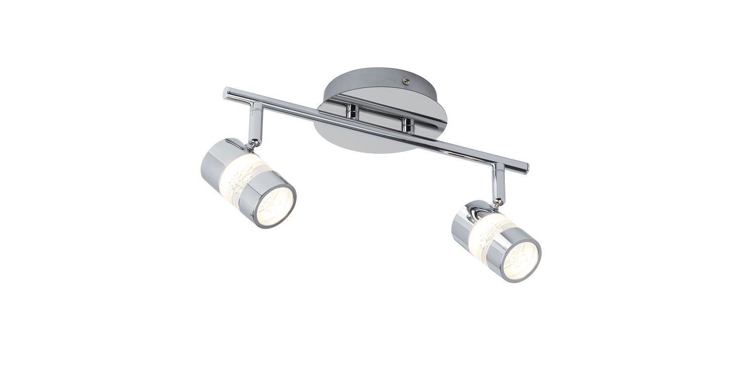 This Bubbles chrome LED 2 Light spotlight bar looks fantastic on the ceiling of any bathroom. The sleek, chrome bar fitting has the latest LED technology with bubble effect shades, which are both quirky and stylish, and the IP44 protection makes it suitable for all bathrooms. This spotlight provides an adjustable source of light and an interesting feature. LED's use up to 75% less energy and last up to 20 times longer than incandescent bulbs. 150mm H x 130mm W x 325mm L 150mm Total Height Bulb Type- LED Intergrated