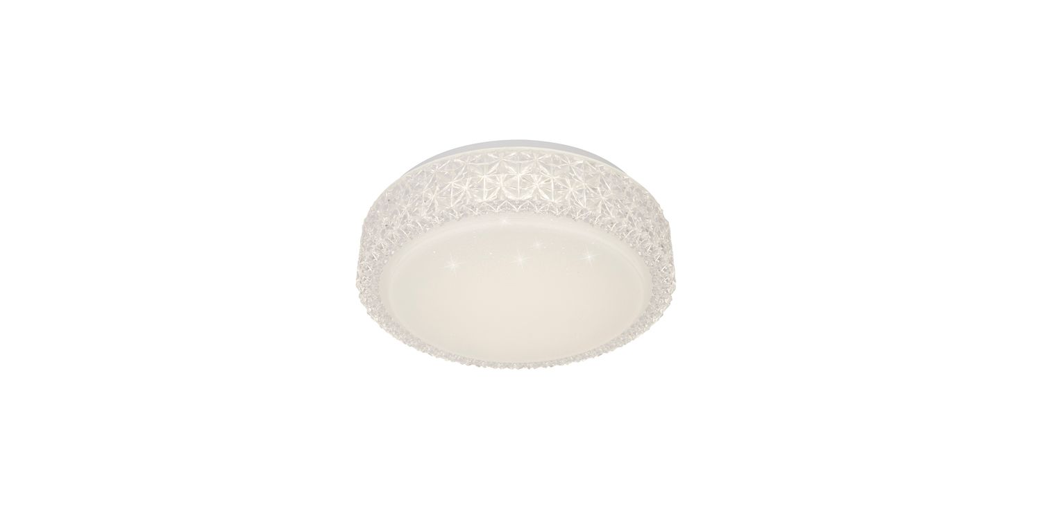 Illuminate your space with the Leo LED Flush Fitting in a stunning star finish. This modern fixture boasts white and clear acrylic materials, emanating a captivating light effect. With dimensions of 280mm width and length, and a total height of 90mm, it offers balanced illumination. Enjoy the energy efficiency of integrated LED lighting and experience celestial ambiance with this elegant flush fitting. 90mm H x 280mm W x 280mm L 90mm Total Height Bulb Type- LED Intergrated