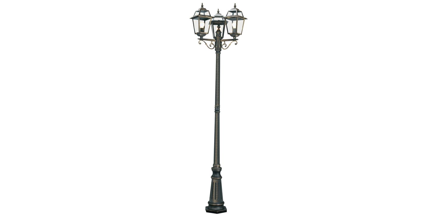 This New Orleans Black/Gold 3 Light Outdoor Post Lamp with Clear Glass brings a look of The Big Easy to your home. The traditionally designed street lamp has a tall cast aluminium post and three ornate cast aluminium lamps at the top, with clear glass to light your garden and outdoor areas. And it is IP44 rated and fully splashproof to protect against the elements. 2270mm H x 550mm W 2270mm Total Height Bulb Type- E27 Not included