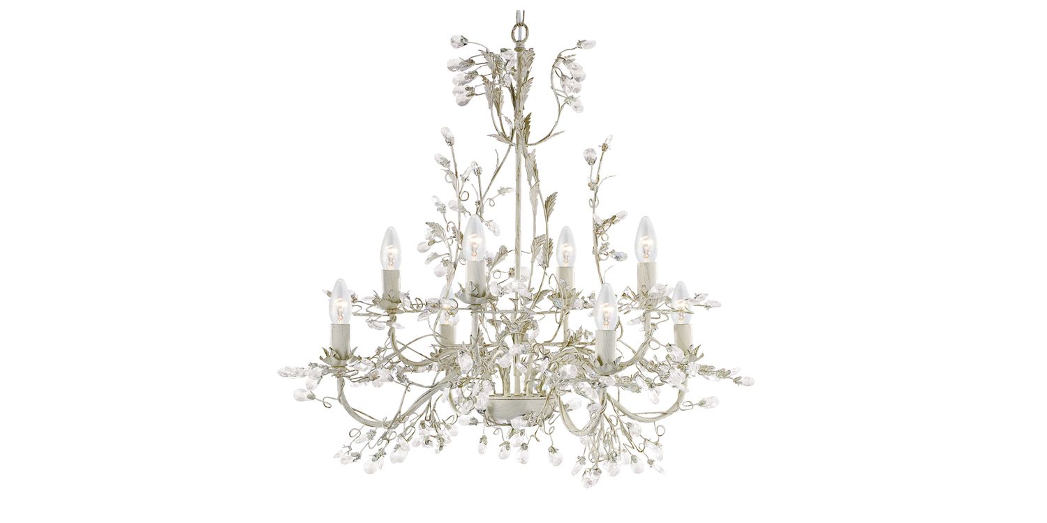 This Almandite cream & gold finish 8 light chandelier with glass drop dressings will add a touch of class to any bedroom, living room, dining room or hallway. The traditional cream and gold finish gives the light a classic look and the glass dressing is both intricate and elegant. The eight lights sit gracefully within this pendant, forming a stunning centre peice creating beautiful lighting effects throughout the evening. Height adjustab;e, this 8 light pendant can be adpated to suit different ceiling heihts or to create different atmospheres in any room. 1330mm H x 740mm W 1330mm Total Height Bulb Type- E14 Not Included