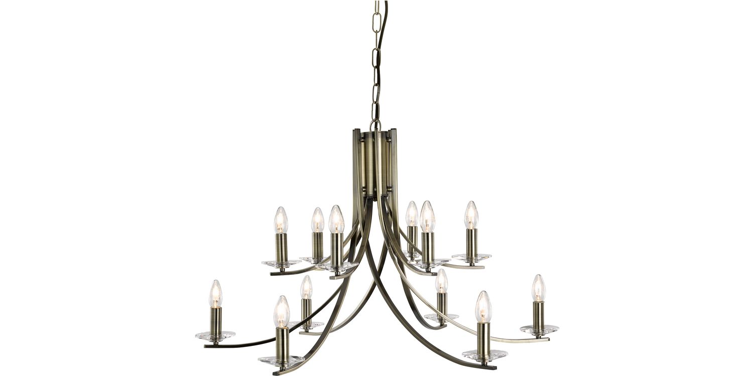 This Ascona antique brass 12 light pendant has a traditional design with a modern twist. Featuring 12 lampholders which expose 12 candle lamps with delicate glass sconces across two separate tiers adding depth and detail to the pendant. Height adjustable with the chain suspension, this 12Lt pendant can be adapted for differing ceiling heights or do hang low and add atmosphere to any room. 2620mm H x 880mm W x 880mm L 2620mm Total Height Bulb Type- E14 Not Included