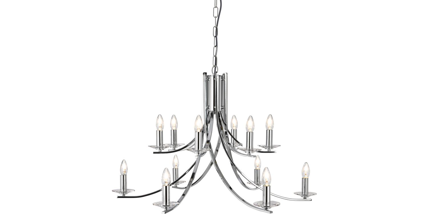 This Ascona chrome 12 light pendant has a traditional design with a modern twist. Featuring 12 lampholders which expose 12 candle lamps with delicate glass sconces across two separate tiers adding depth and detail to the pendant. Height adjustable with the chain suspension, this 12Lt pendant can be adapted for differing ceiling heights or do hang low and add atmosphere to any room. 2620mm H x 880mm W x 880mm L 2620mm Total Height Bulb Type- E14 Not Included