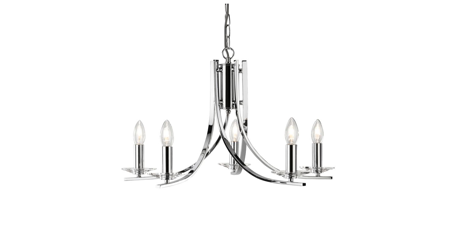 The Ascona chrome 5 light pendant is a classic design with a modern twist. The stunning chrome finish is simple, elegant and perfect for any bedroom, living room or dining room, and the five clear glass scones illuminate any room with style and sophistication. Height adjustable, this pendant can work with many ceiling heights and décor styles. 1200mm H x 620mm W x 620mm L 1200mm Total Height Bulb Type- E14 Not Included