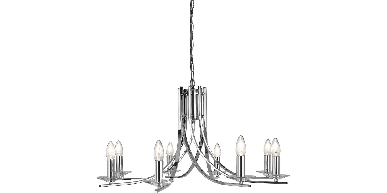This Ascona chrome 8 light pendant is a classic design with a modern twist. The chriome finish adds a contemporary feel and is ideal for any bedroom, living room, hallway or dining room. The eight clear glass sconces house exposed candle style lamps to illuminate any room with style and sophistication. Height adjustable, the pendant can be adapted to suit different ceiling heights and décor styles. 1450mm H x 750mm W x 750mm L 1450mm Total Height Bulb Type- E14 Not Included