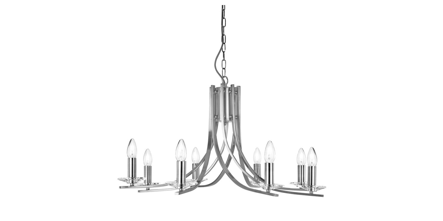 Bring sophistication to any home with this eye-catching Ascona 8 light pendant. The attractive vintage inspired look features curved arms each holding a clear glass sconce. The satin silver finish is timeless and will add a finishing touch to any home setting. Height adjustable, this pandant can be adapted to work with different ceiling heights. 1450mm H x 750mm W x 750mm L 1450mm Total Height Bulb Type- E14 Not Included