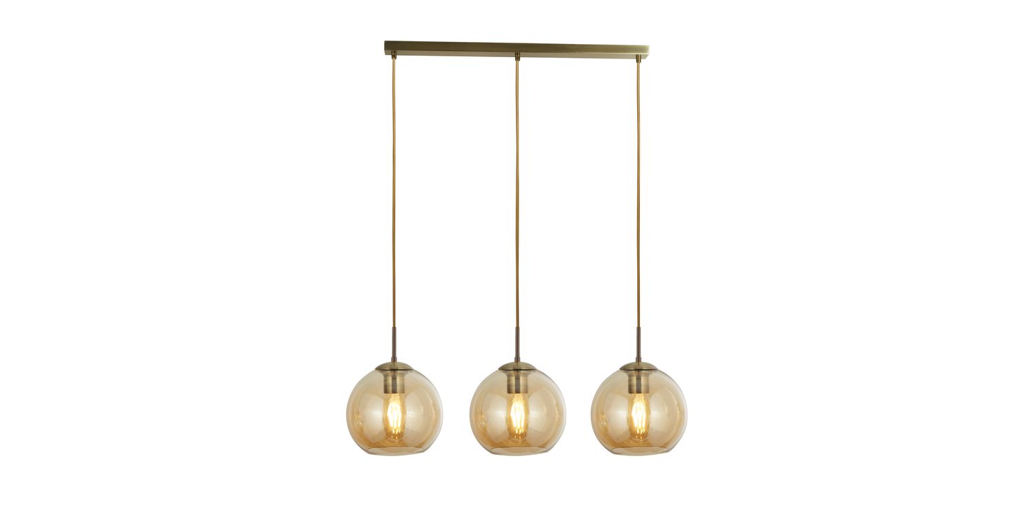 Revamp your living space with our 3 light Balls bar pendant in an antique brass finish and amber glass shades. The glass ball shades make this a distinctive product to hang in your kitchen area whether it's above a kitchen island or a dining room table. 1500mm H x 200mm W x 860mm L 1500mm Total Height Bulb Type- E27 Not included