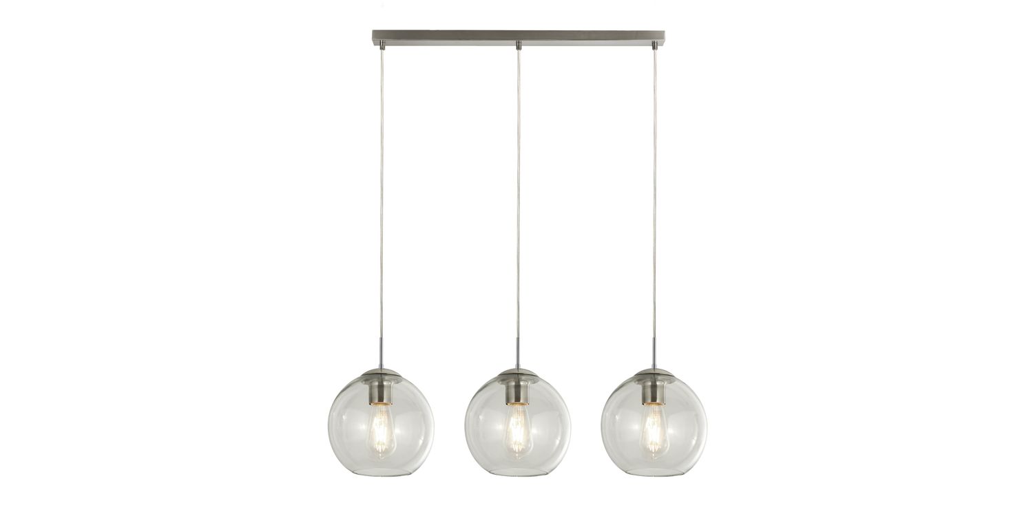 Revamp your living space with our 3 light Balls bar pendant in a chrome finish and clear glass shades. The glass ball shades make this a distinctive product to hang in your kitchen area whether it's above a kitchen island or a dining room table. 1500mm H x 200mm W x 860mm L 1500mm Total Height Bulb Type- E27 Not included