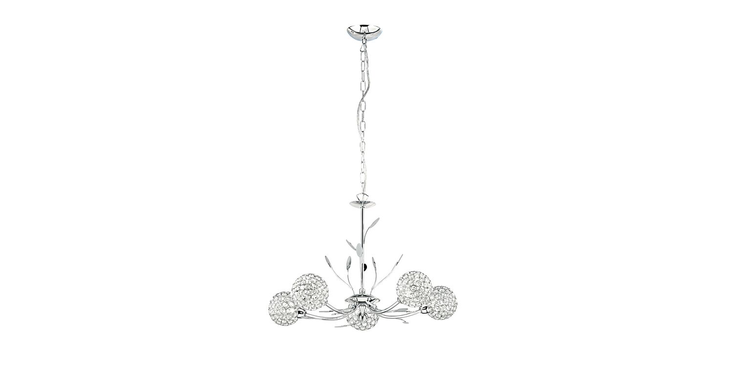 This Bellis II chrome 5 light pendant with clear glass shades and leaf decoration will make a stunning centre piece for any bedroom, living room, dining room or hallway ceiling. This elegant chrome finish pendant is beautifully crafted with leaf decoration and five clear glass and chrome flower head spheres, which refract the light to stunning effect. This height adjustable pendant can be easily adapted to different ceiling heights. 1200mm H x 580mm W x 580mm L 1200mm Total Height Bulb Type- G9 Not Included