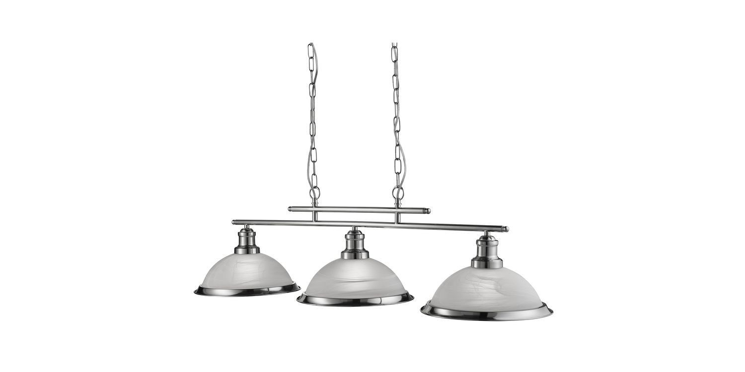 This Bistro satin silver 3 light ceiling bar pendant with alabaster glass shades has a simplistic look that will add a retro feel to any dining room or kitchen. Reminiscent of the style of classic diners and bistros, the ceiling light comprises of three classic art deco shades positioned along a sleek satin silver finish bar, with alabaster glass to provide clean lighting effects. It brings a distinctive and elegant style to any setting, and the chain can be adjusted for different ceiling heights. 1200mm H x 280mm W x 1000mm L 1200mm Total Height Bulb Type- E27 Not included