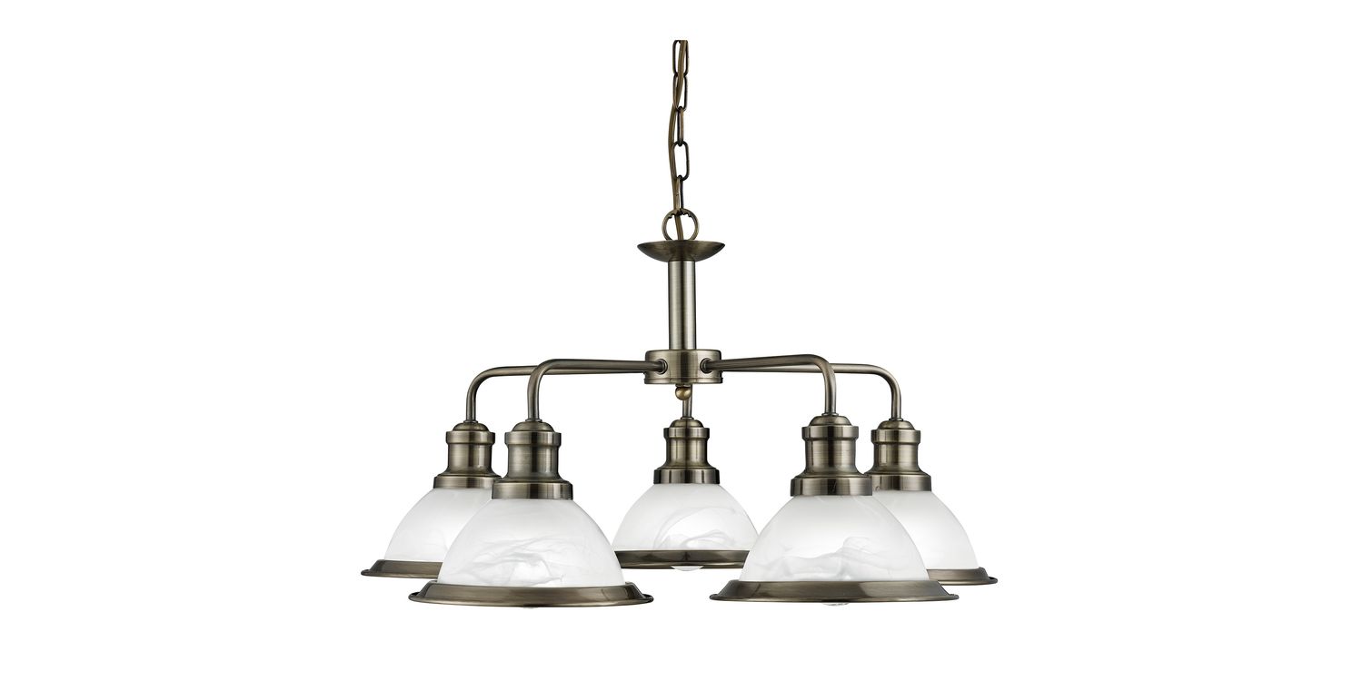 This Bistro antique brass 5 light pendant with acid glass shades has a simplistic look that will add a retro feel to any dining room or kitchen. Reminiscent of the style of classic diners and bistros, this ceiling light comprises five classic art deco shades finished in a traditional antique brass, with acid glass to provide clean lighting effects. This ceiling pendant brings a distinctive and elegant style to any setting, and the chain suspension can be adjusted for different ceiling heights. 1200mm H x 630mm W x 630mm L 1200mm Total Height Bulb Type- E27 Not included