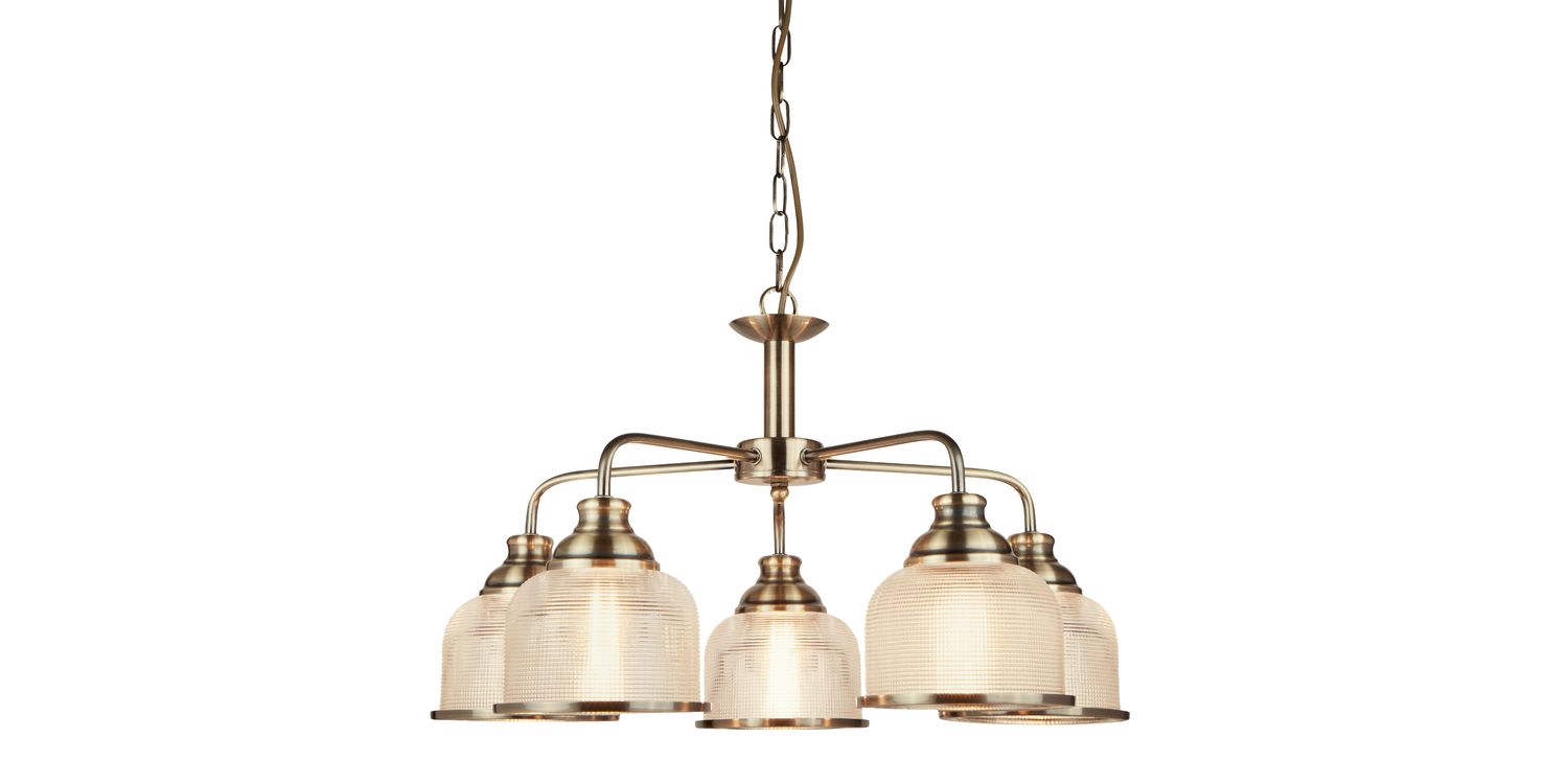 The 5 light pendant of the Bistro II range is a simple way to elevate and beautifully brighten any home. This antique brass fitting is idea for the kitchen or dining room of a traditional and classic styled home. This attractive 5Lt pendant is crafted using holophane style glass and antique brass metal to create a vintage feel. Height adjustable, this pendant can adapt to any different ceiling heights. 1200mm H x 580mm W x 580mm L 1200mm Total Height Bulb Type- E27 Not included