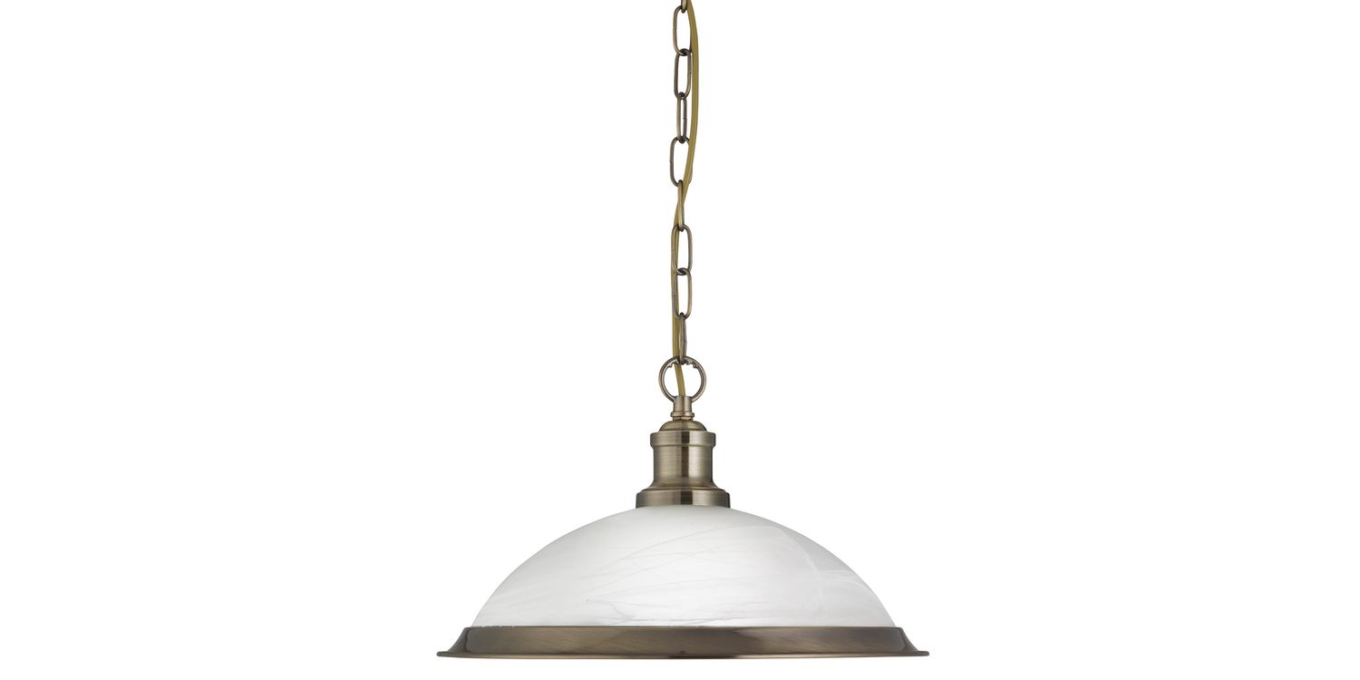 This Bistro antique brass pendant light with marble glass shade has a simplistic look that will add a retro feel to any dining room or kitchen. Reminiscent of the style of classic diners and bistros, the ceiling light comprises of a classic art deco shade finished in a traditional antique brass, with acid glass to provide clean lighting effects. This ceiling light brings a distinctive and elegant style to any setting, and the chain can be adjusted for different ceiling heights. 1200mm H x 340mm W x 340mm L 1200mm Total Height Bulb Type- E27 Not included