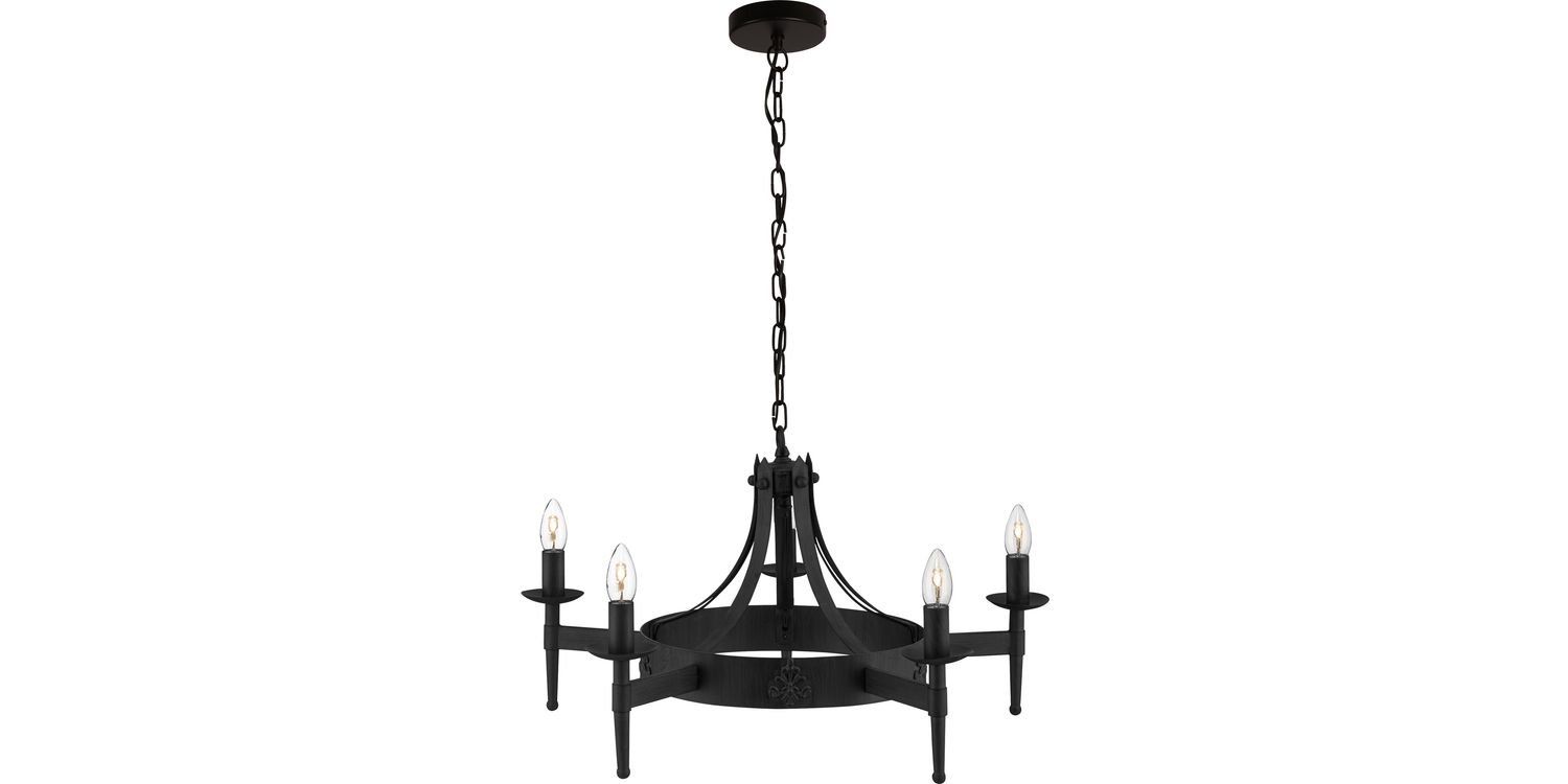 This Cartwheel II 5 light pendant in black wrought iron will give any bedroom, living room, dining room or kitchen ceiling a look of the old world, transporting you back to castles in medieval times. The wrought iron effect fitting is Gothic in style, and the five lampholders which house candle lamps will provide a cosy source of lighting, giving a home a traditional, welcoming feel. Height adjustable, this pendant can then be adapted to fit different ceiling heights or to fake a feature, like over a dining table, to create an atmospheric effect. 1200mm H x 670mm W x 670mm L 1200mm Total Height Bulb Type- E14 Not Included