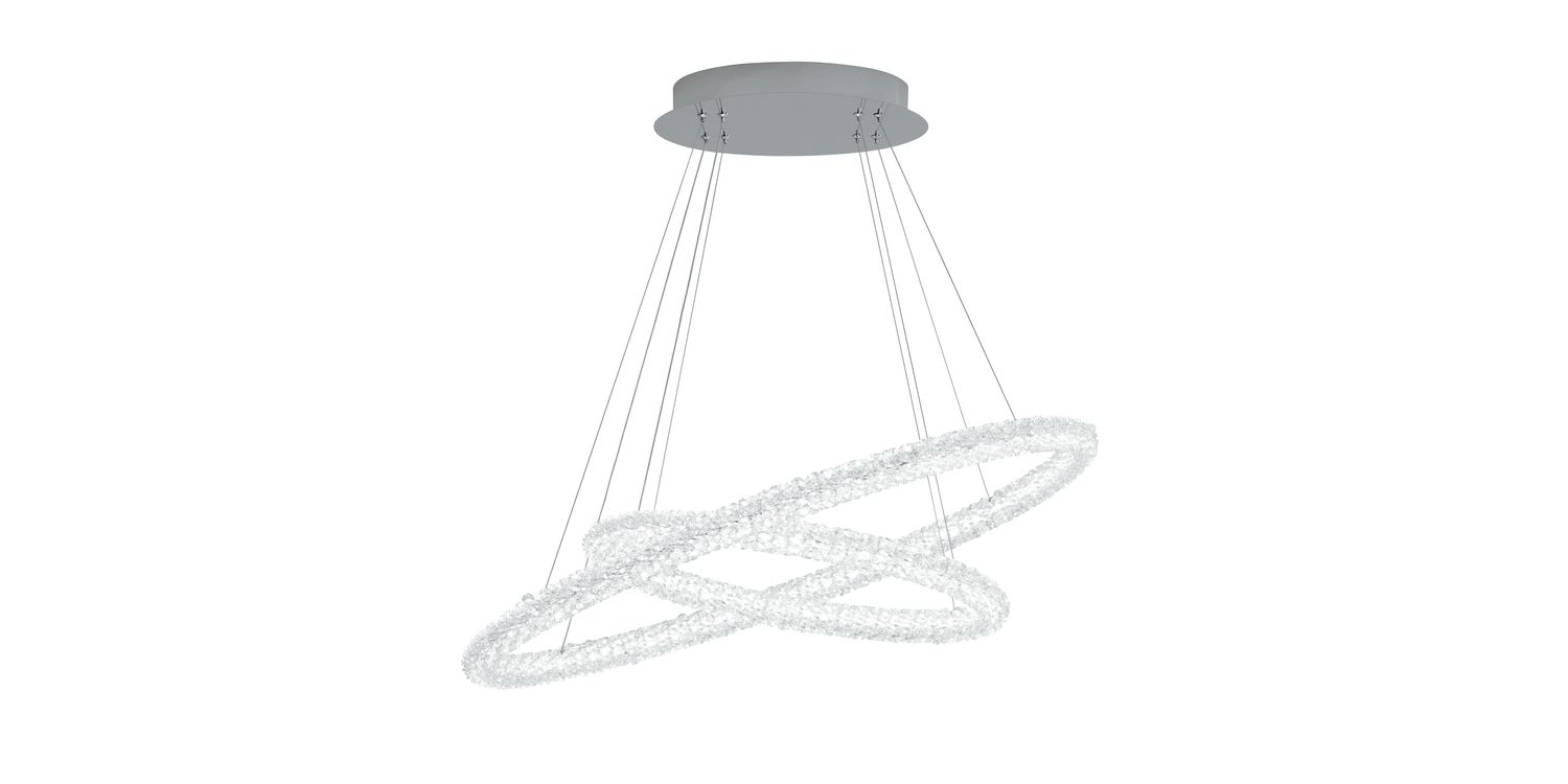 This ring Pendant will bring elegance to your home with its sophisticated design. Two interlinked rings embellished with clear crystal detail suspend from a classic chrome base. Ideal as the centrepiece for any high ceiling. LED's use up to 75% less energy and last up to 20 times longer than incandescent bulbs. 1260mm H x 830mm W x 535mm L 1260mm Total Height Bulb Type- LED Intergrated