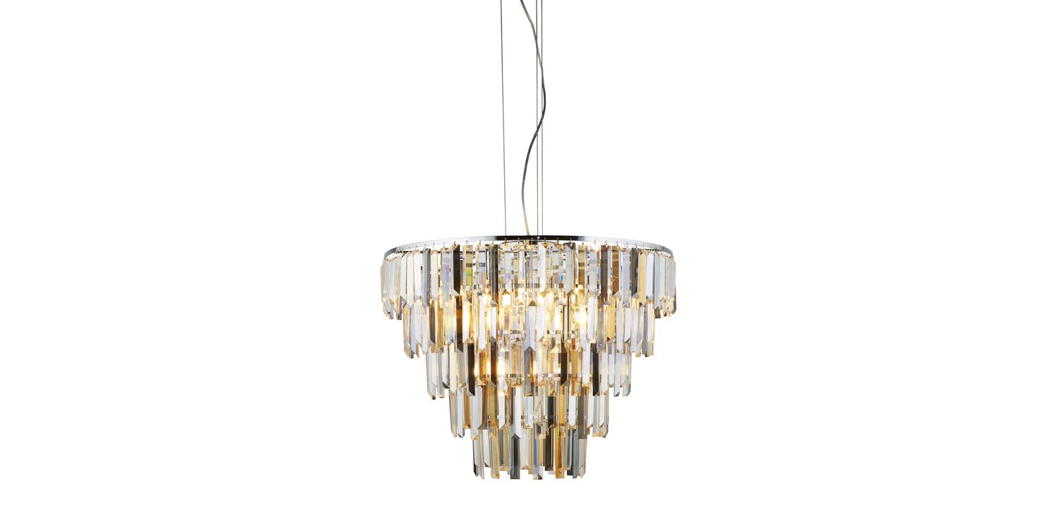 Update your interior with this striking Clarissa 9 light pendant. A new addition to an existing range. A mix of clear, amber and smoked crystal drops cascade over the lights and the illumination reflects beautifully. Place in the centre of any room for a truly sophisticated look. 1700mm H x 650mm W x 650mm L 1700mm Total Height Bulb Type- E14 Not Included