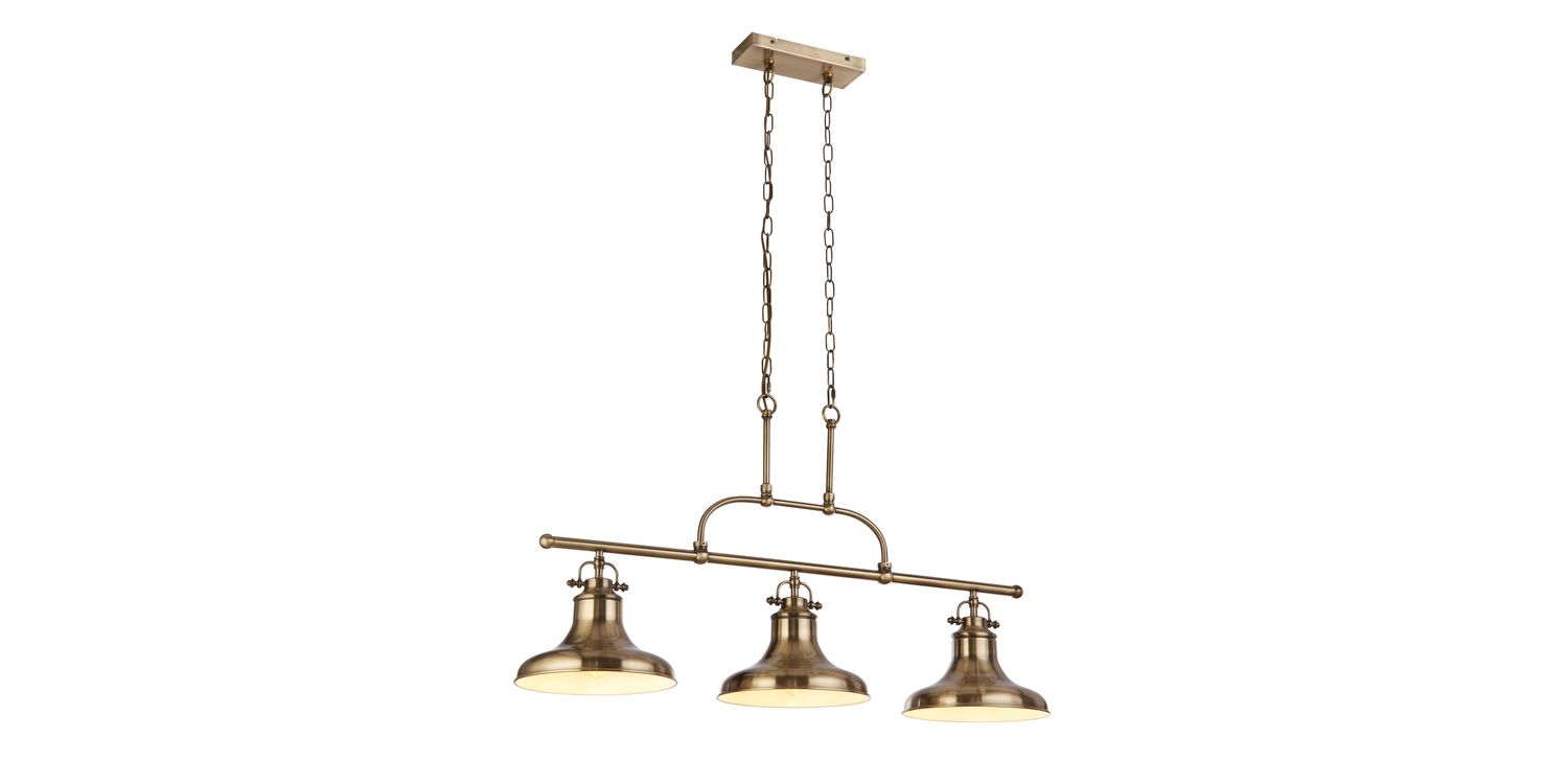 The Dallas 3Lt Bar Pendant is a versatile and stylish lighting solution designed to elevate any kitchen or dining room. Formed with durable mild steel with an antique brass finish, this pendant showcases a timeless appeal that effortlessly complements both contemporary and traditional spaces. The pendant features three lights on a sleek bar design, providing ample illumination to brighten up your room. Height adjustable, this pendant can be altered to fit the room it illuminates, and will look particularly stylish hung low over a kitchen island or dining table. 1500mm H x 260mm W x 960mm L 1500mm Total Height Bulb Type- E27 Not included