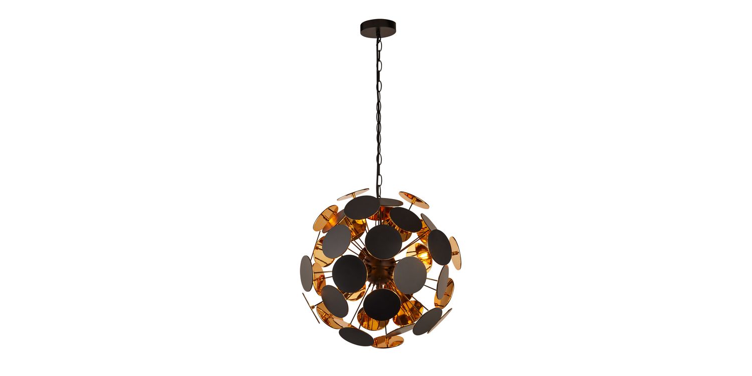 The Discus 4 light pendant has a matt black finish. The shade features metal spikes with rounded disc ends and a paint gold inner. The incandescent pendant can be used in a lounge, bedroom or hallway and is dimmable to choose your ideal light setting. 1350mm H x 470mm W x 470mm L 1350mm Total Height Bulb Type- E14 Not Included