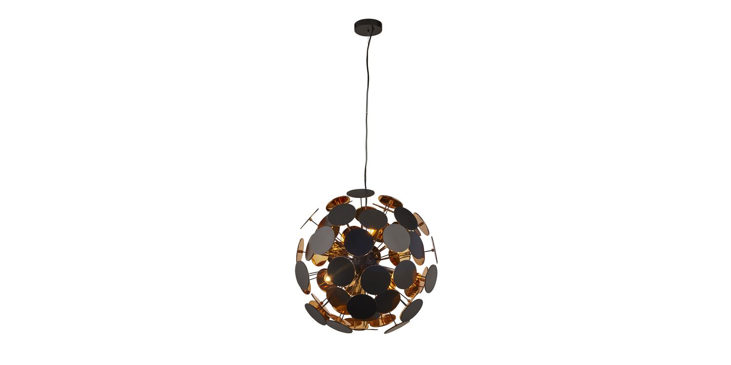 The Discus 6 light pendant has a matt black finish and 4 light sources. The shade features metal spikes with rounded disc ends and a paint gold inner. The incandescent pendant can be used in a lounge, bedroom or hallway and is dimmable to choose your ideal light setting. 1300mm H x 540mm W x 540mm L 1300mm Total Height Bulb Type- E14 Not Included
