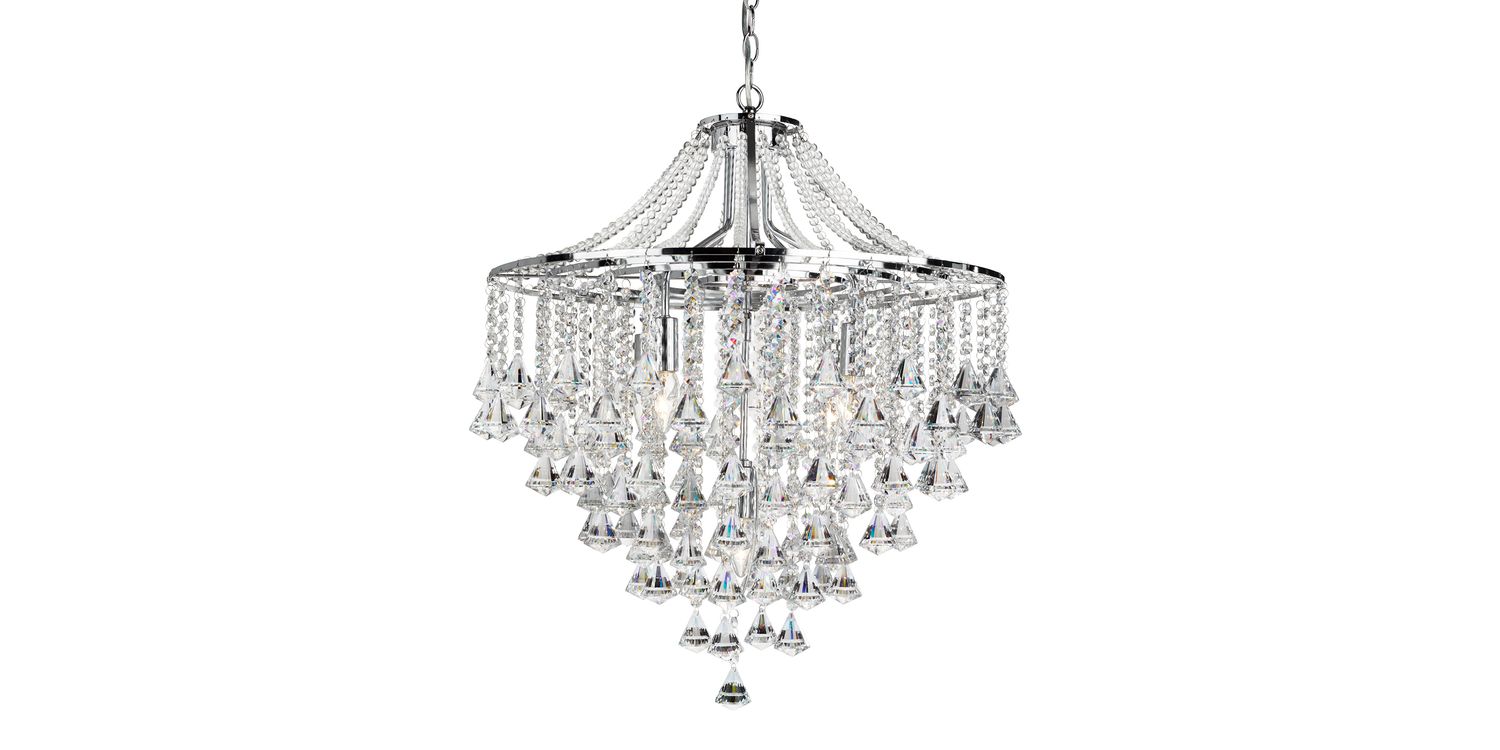 The Dorchester chrome 5 light chandelier is a stand out pendant which will create a stunning focal point in any home. With clear crystal drops and buttons it is unmistakably bold and stylish, adding a glamorous feel to any living space or entrance hallway. The pendant is adorned with chunky crystal buttons and drops, which refract the light beautifully, and the elaborate chrome finish fitting has cascading crystal beads, from the top of the fitting to the main frame. Height adjustable, this 5 light pendant can be adapted to suit the ceiling height of any home. 2100mm H x 640mm W x 640mm L 2100mm Total Height Bulb Type- E14 Not Included