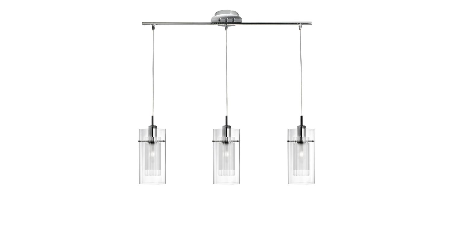 This Duo I chrome 3 light bar pendant with double glass cylinder shades looks modern and stylish on any dining room or kitchen ceiling, ideally positioned over a breakfast bar or dining table. The three glass shades feature a clear glass outer and a frosted glass inner, which combine to create a graceful source of light. This striking fitting has a sleek chrome finish bar to support the lights and complete the look. 1300mm H x 120mm W x 710mm L 1300mm Total Height Bulb Type- E14 Not Included