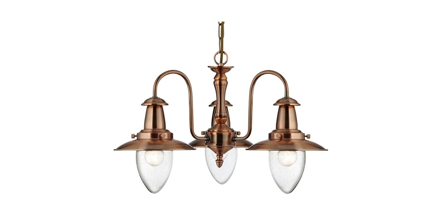 This Fisherman II copper metal 3 light pendant with oval seeded glass features three sturdy shades attached to the central fitting with attractive curved arms. The three industrial-inspired shades have a unique copper finish, with rounded edges and oval seeded glass shades which provides a stylish water droplet effect. This classic 3 light pendant will look at home in any traditional living space. 1200mm H x 520mm W 1200mm Total Height Bulb Type- E27 Not included