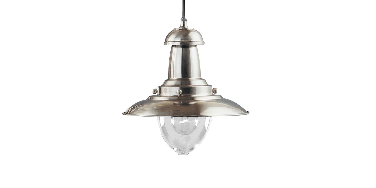 This Fisherman satin silver ceiling light with clear glass shade is a sturdy lantern with a classic, industrial style. The sleek satin silver finish, smooth rounded edges and large clear glass shade of this nautical themed pendant light will enhance your dining area or illuminate your hallway and bring a element of retro design to your interior space. 1200mm H x 320mm W x 320mm L 1200mm Total Height Bulb Type- E27 Not included