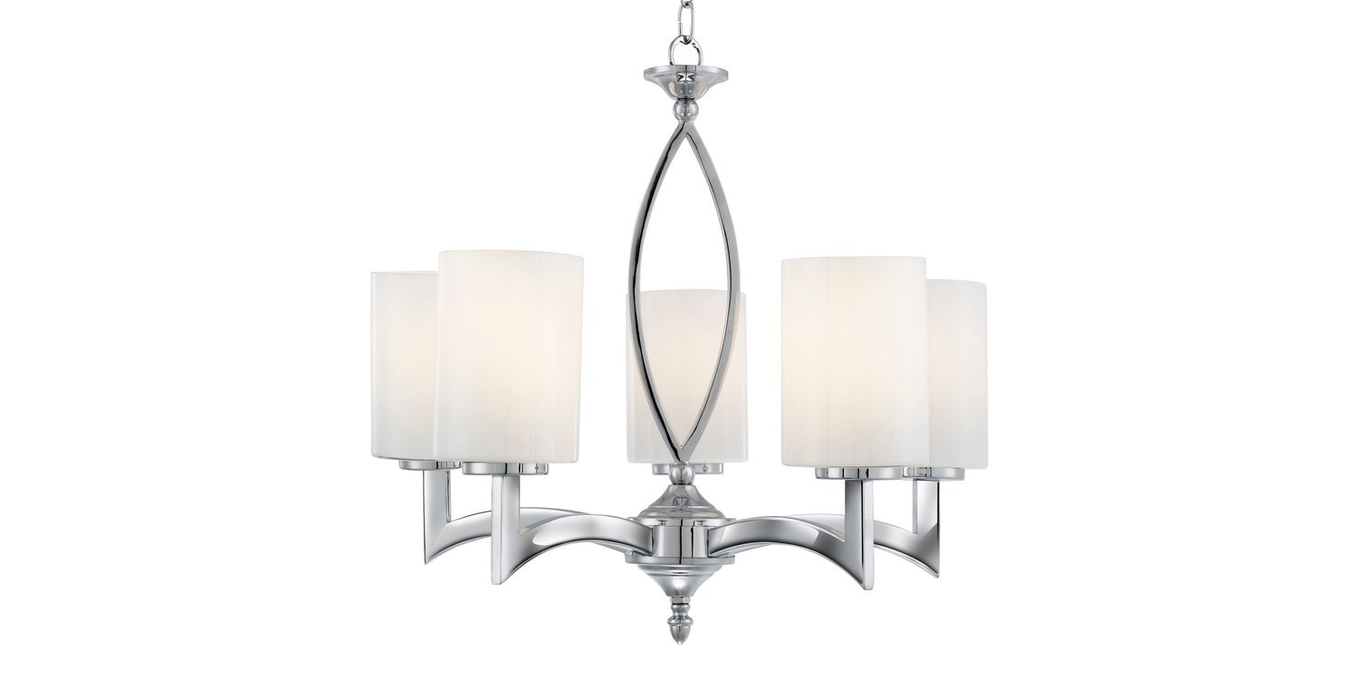 This Gina chrome 5 light ceiling pendant with white glass cylinder shades is modern and elegant. The sleek chrome finish fitting features a split, oval heart shaped column, with curved arms and five opal glass shades, which provide a soft lighting effect. And it provides a focal point for any contemporary living space. 1200mm H x 480mm W x 480mm L 1200mm Total Height Bulb Type- E27 Not included