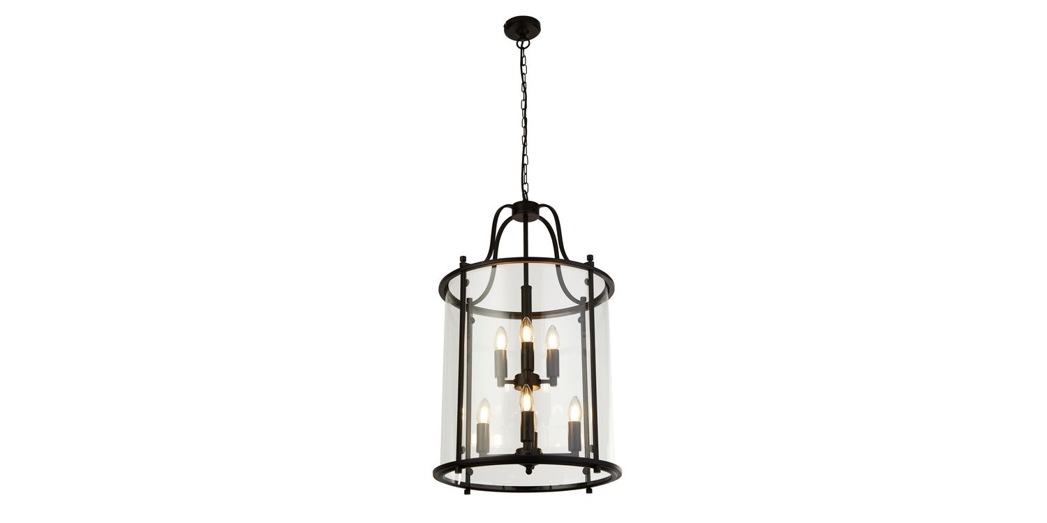 This Victorian Lantern 8 light ceiling fitting has a black finish and clear glass panels and will look stunning in any large room due to its 75cm hight. The sleek glass of the lantern allows the eight lampholders with candle style lamps across two tiers provide to be clearly seen, allowing sufficient light through the curved glass panels for any entrance hall, kitchen or dining area. Height adjustable, with its chain suspension, to suit different ceiling heights, this imposing lantern style pendant will be a focal piece in any home. 1500mm H x 430mm W 1500mm Total Height Bulb Type- E14 Not Included