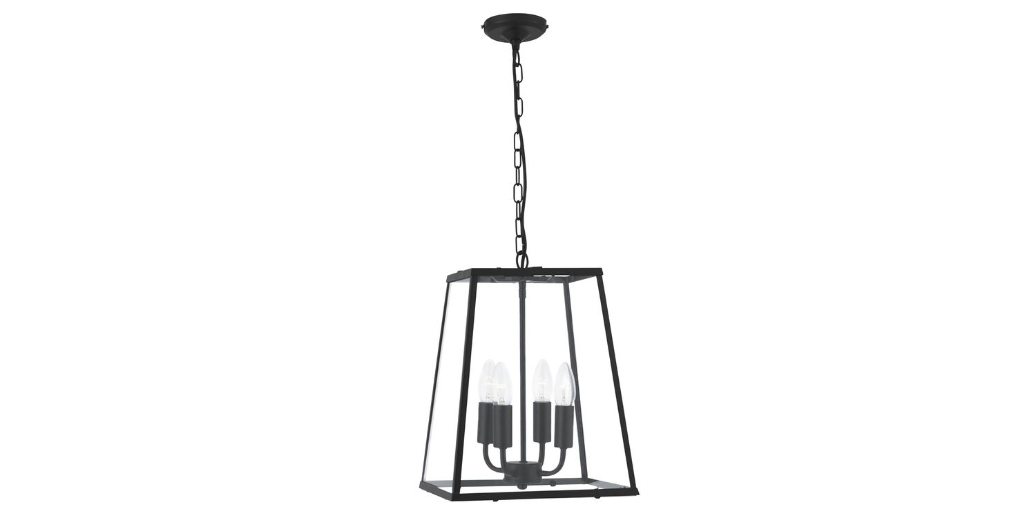 This Lantern Noir tapered 4 light lantern style pendant with clear glass panels has a simple, classic look. The matt black tapered shade has four clear glass panels, which house 4 centrally positioned lampholders holding candle style lamps which will provide a bright source of light for any room. The shade hangs elegantly from the ceiling by a slim black chain suspension which is height adjustable which can be adapted for any ceiling. 1200mm H x 290mm W x 290mm L 1200mm Total Height Bulb Type- E14 Not Included