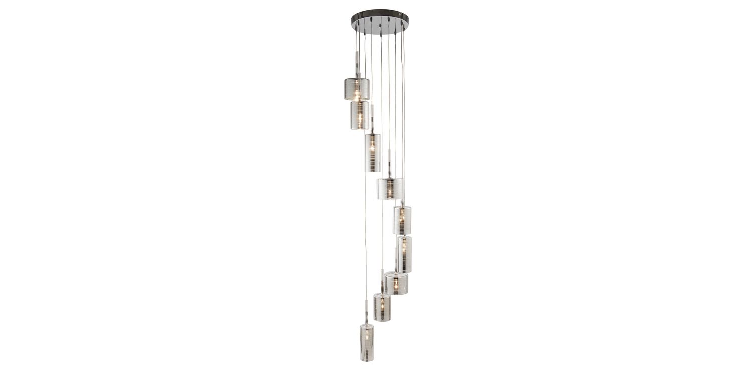 Create a centre piece fit for any contemporary home with this Linen chrome Multi-drop pendant. 9 lights hang at different lengths and will provide a generous glow. The varying in size heads contain a ribbed effect inside of the shade. Match with the 1936-6CC 9 light Multi-drop pendant. 1850mm H x 400mm W x 400mm L 1850mm Total Height Bulb Type- G4