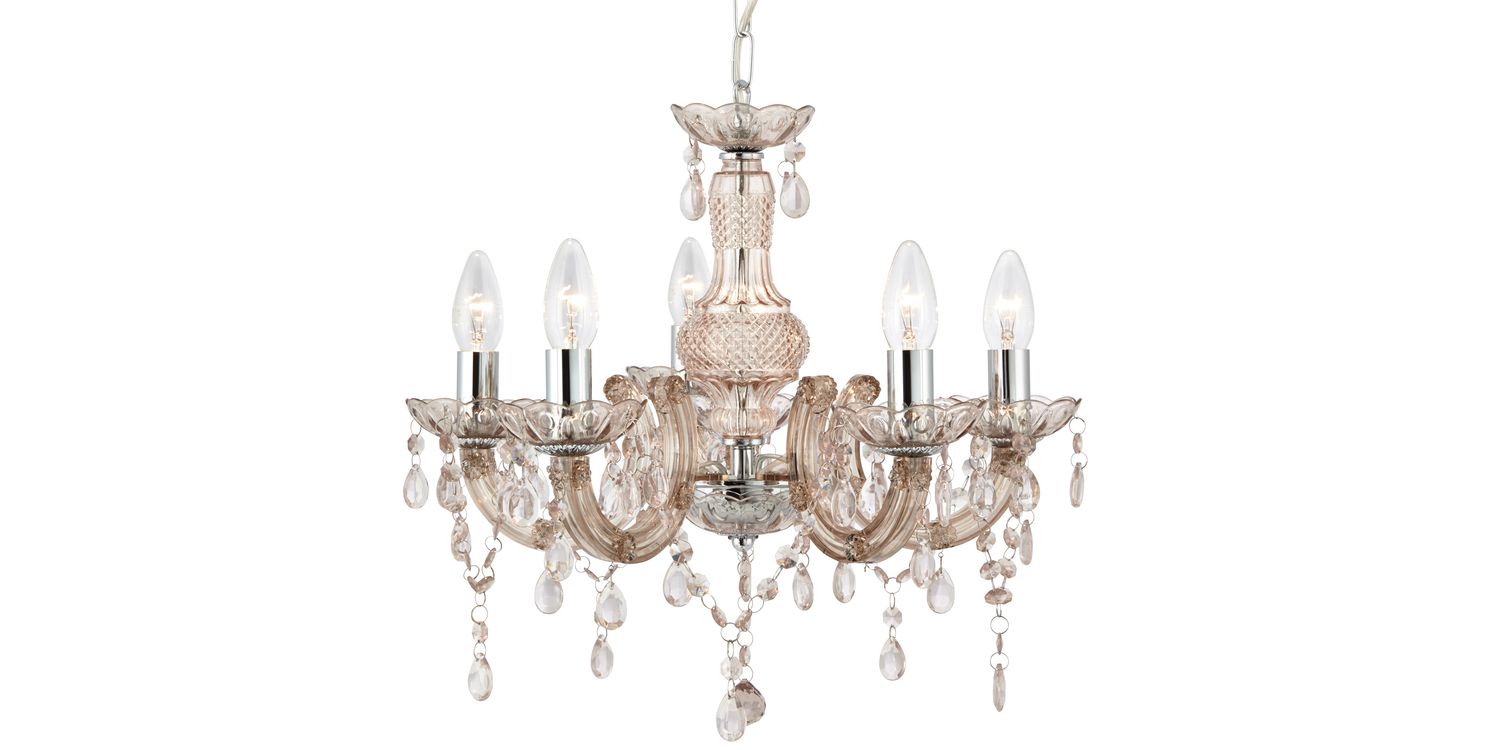 The spectacular, stylish Marie Therese 5 light pendant with a unique mink glass finish has an aristocratic style, perfect for adding a theatrical touch to any large room. A traditional design with a modern twist, this chandelier pendant is luxuriously adorned with clear glass pear-shaped drops, curved arms and acrylic glass trimmings that add a glamorous focal point to any interior. Height adjustable, this pendant can be adapted to suit differing ceiling heights, adding a modern finish to any living space, bedroom or hallway. 1200mm H x 480mm W x 480mm L 1200mm Total Height Bulb Type- E14 Not Included